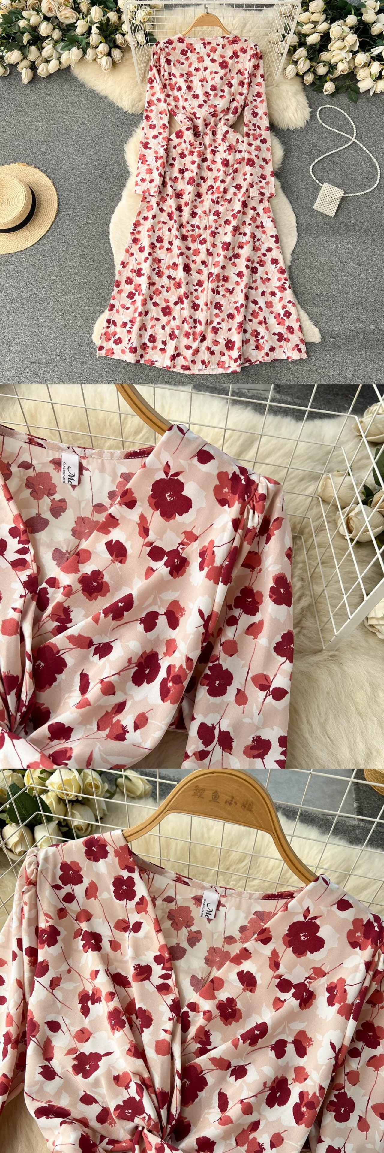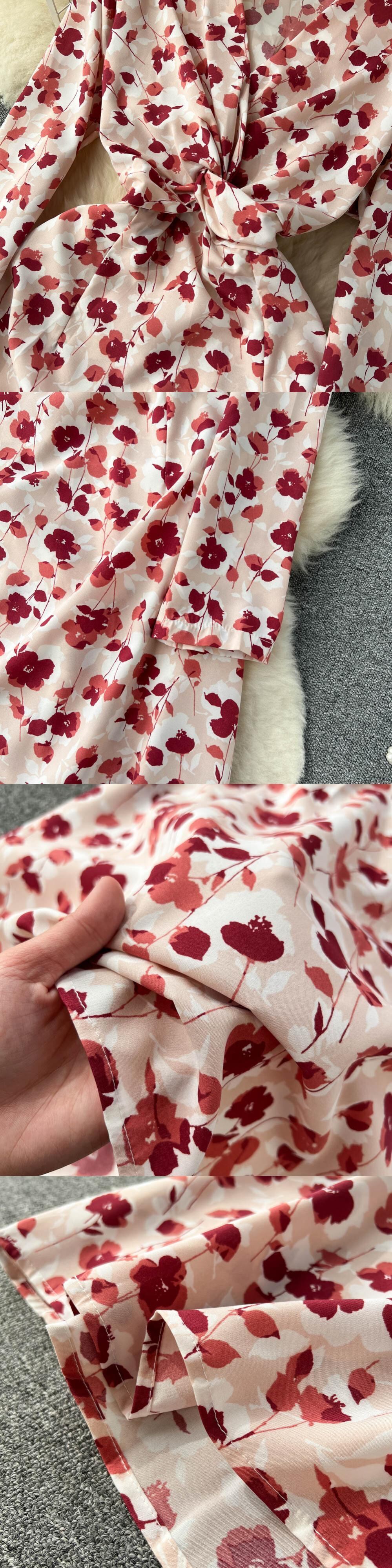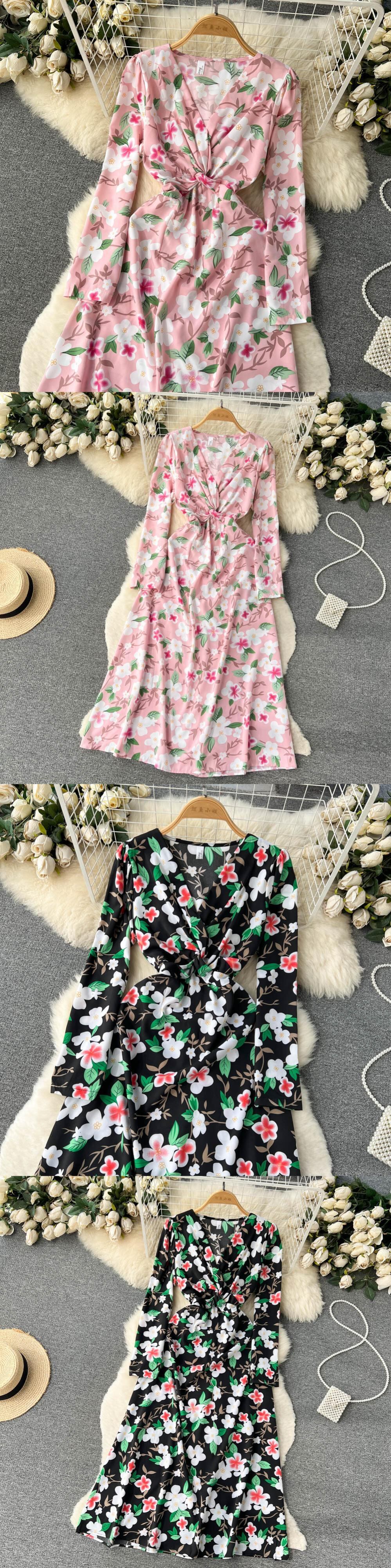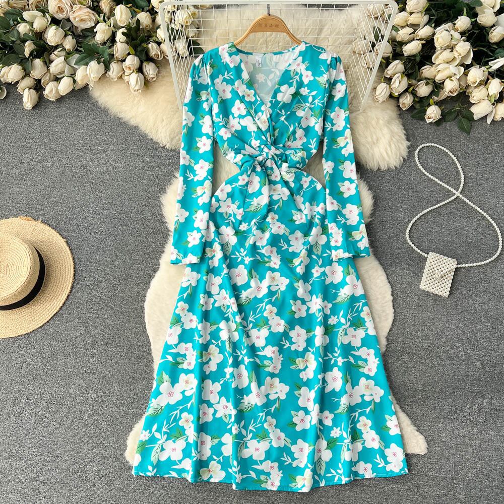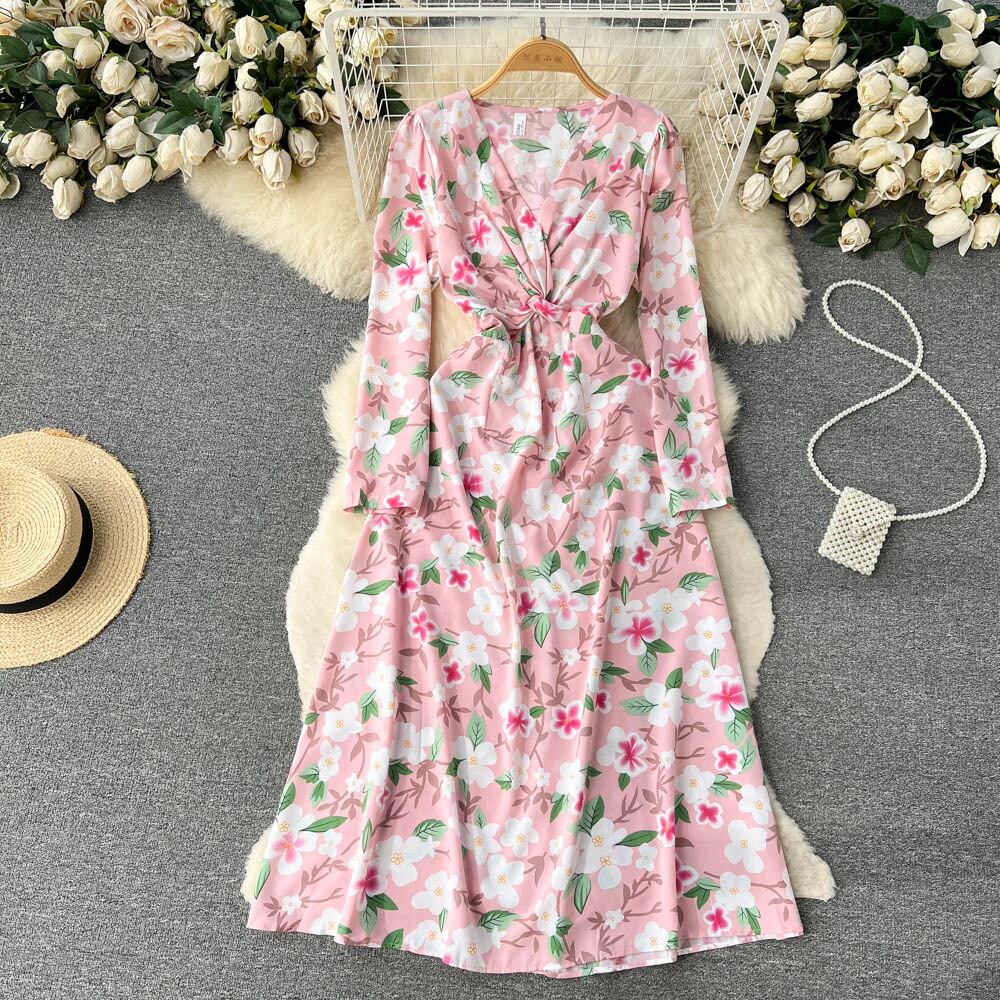 春と秋の新しい V ネック花柄のドレスの女性のハイエンド感長袖フレンチ初恋プリント気質の妖精のドレス ロング スプリング 春物 オータム 秋物 Vネック lyxaj231554894
