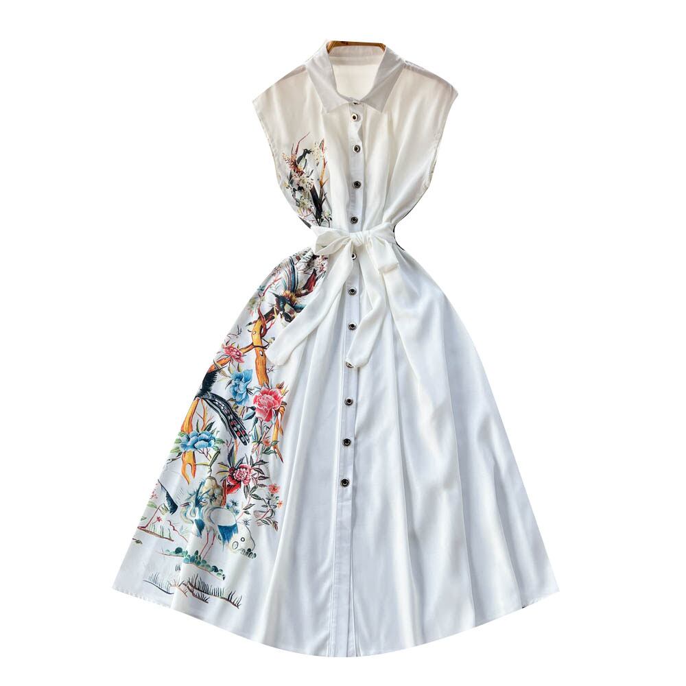 夏のファッション eign スタイル プリント ドレス女性のポロ襟シングル ブレスト ボタン ノースリーブ ウエスト ミドル丈 A ライン スカート トレンディ サマー 夏物 Aライン lyxaj61019683174