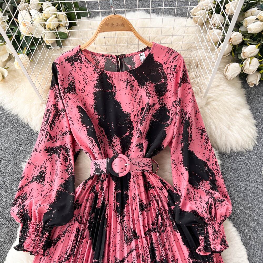 ヨーロッパとアメリカのスタイルのレトロな印刷重工業プレスプリーツドレスレディースロングスカート気質小さなスタンドカラースリムライト大人のドレス女性 ヨーロピアン lyxaj79128158330