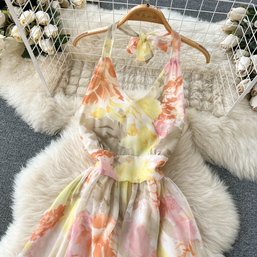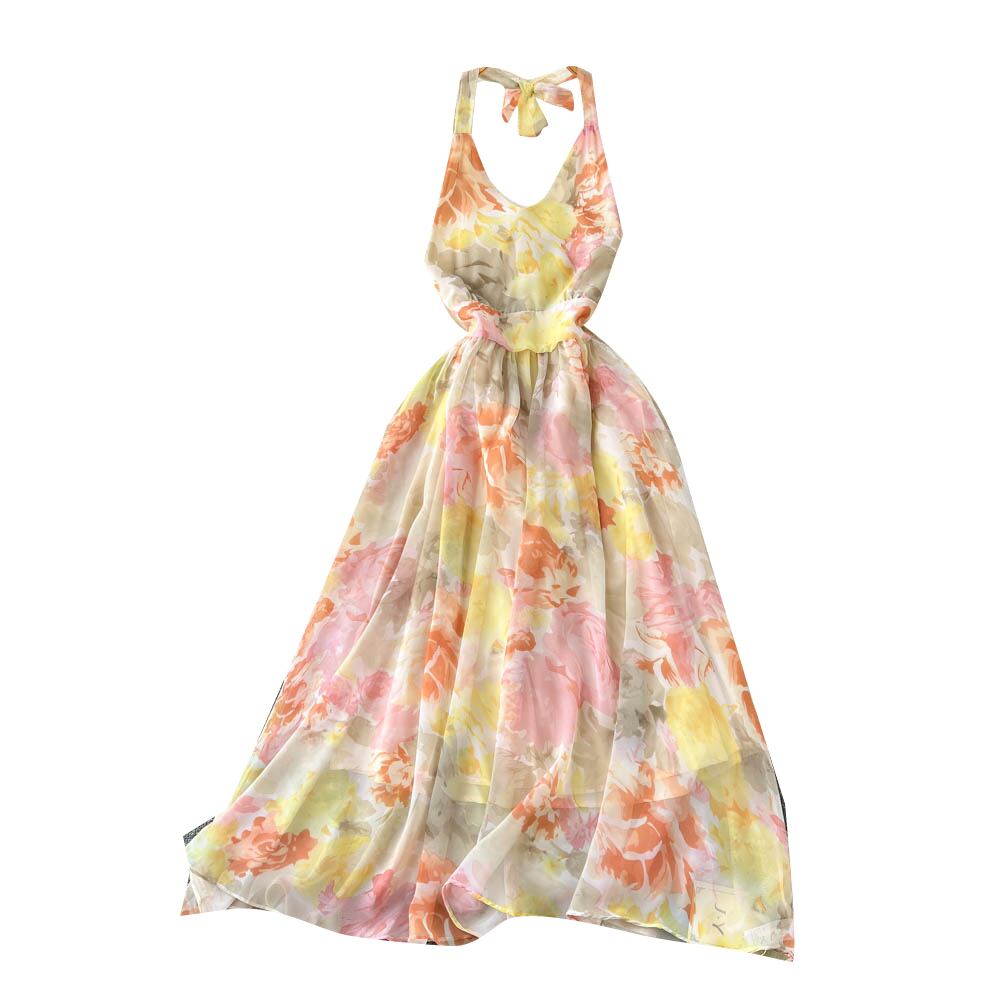 ホルターネック スイート メッシュ シフォン 花柄ドレス 女性 夏 ウエスト セクシー 海辺 休日 風 妖精 ビーチ スカート 大人ガーリー スウィート キュート カジュアル サマー 夏物 lyxaj34385611349