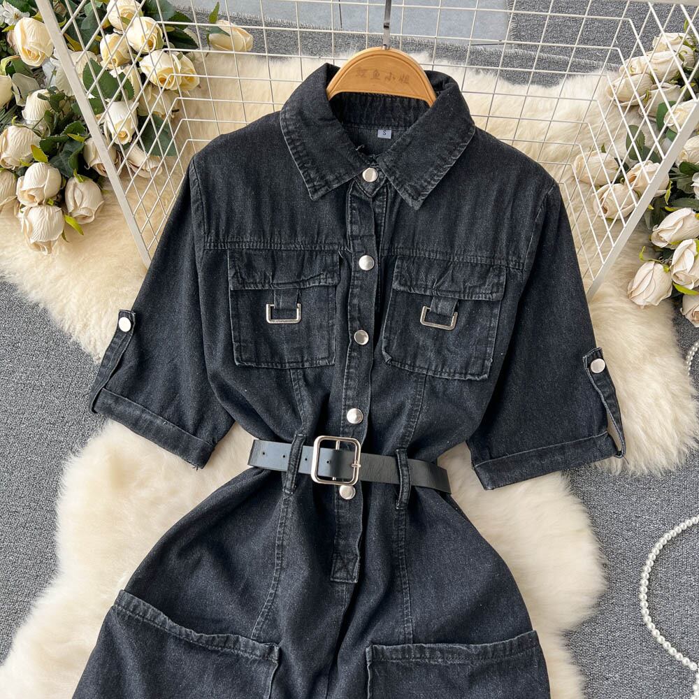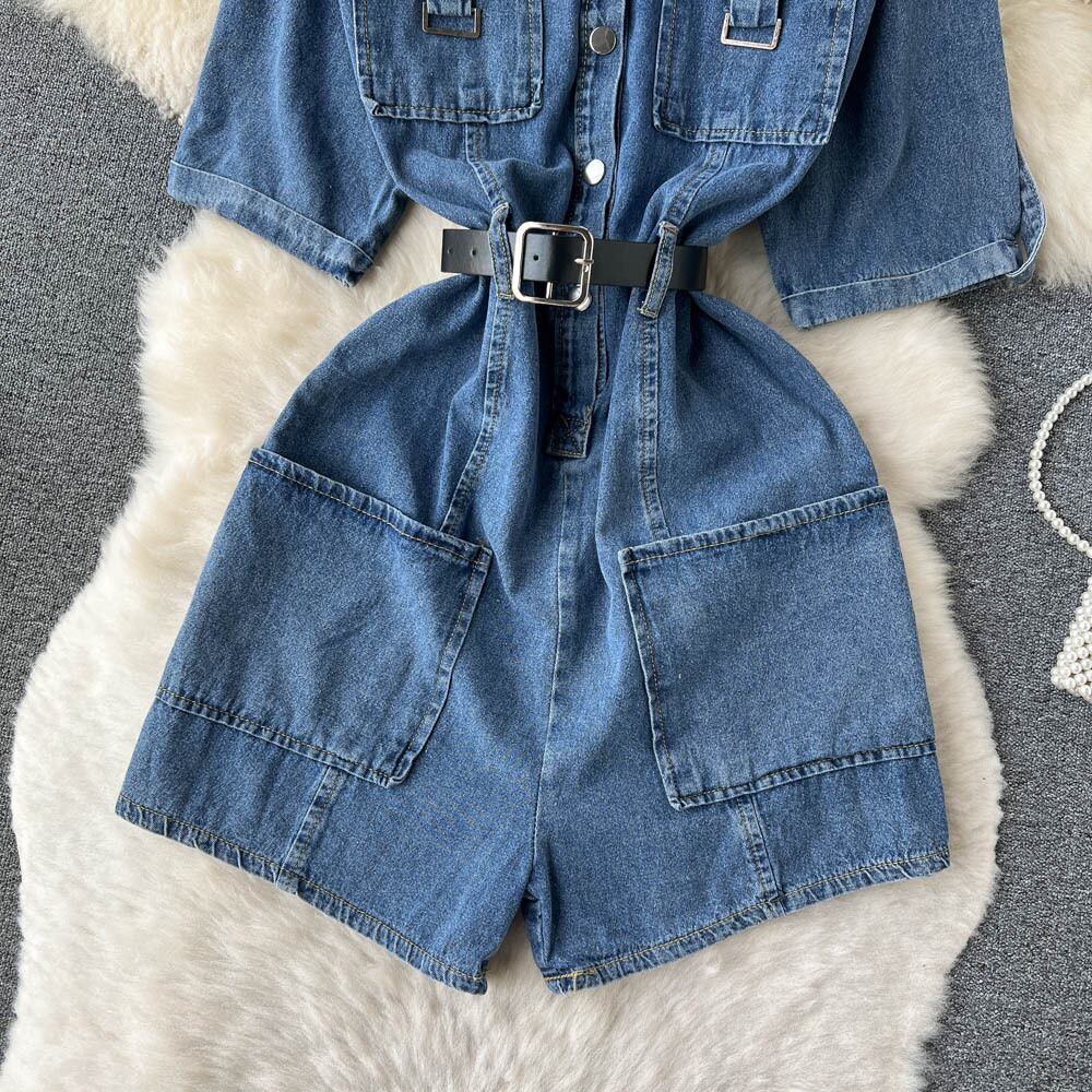 ウエストのバージョン半袖デニムジャンプスーツ女性の夏のレトロシックなデザインのポケットラペルジャンプスーツ サマー 夏物 lyxaj40049681096