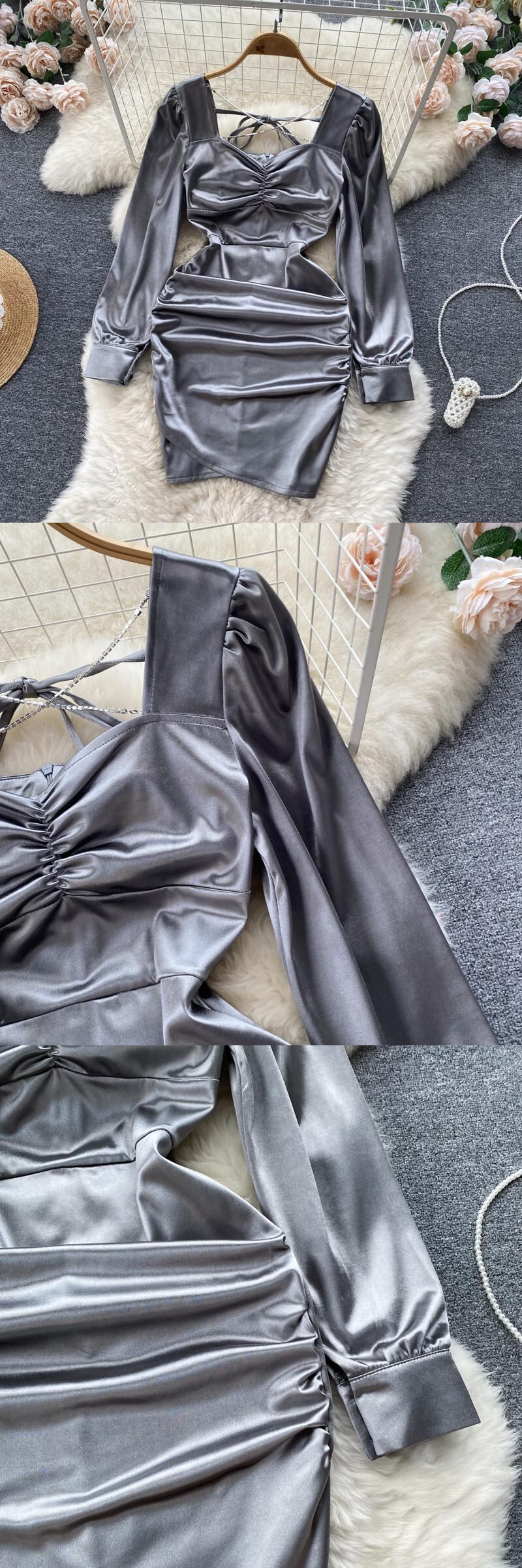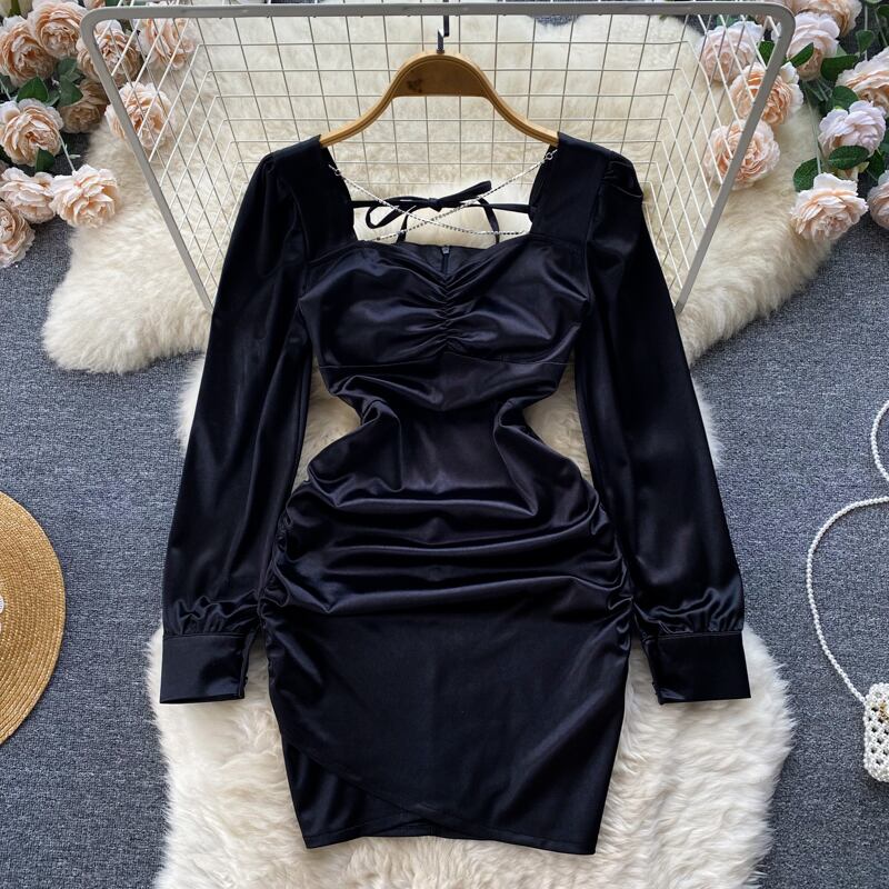 -エンド ニッチ デザイン 気質 スクエア カラー ドレス 秋 フレンチ ウエスト 痩身 長袖 バッグ ヒップ スカート 女性 ロング オータム 秋物 スクウェア lyxaj24300674517