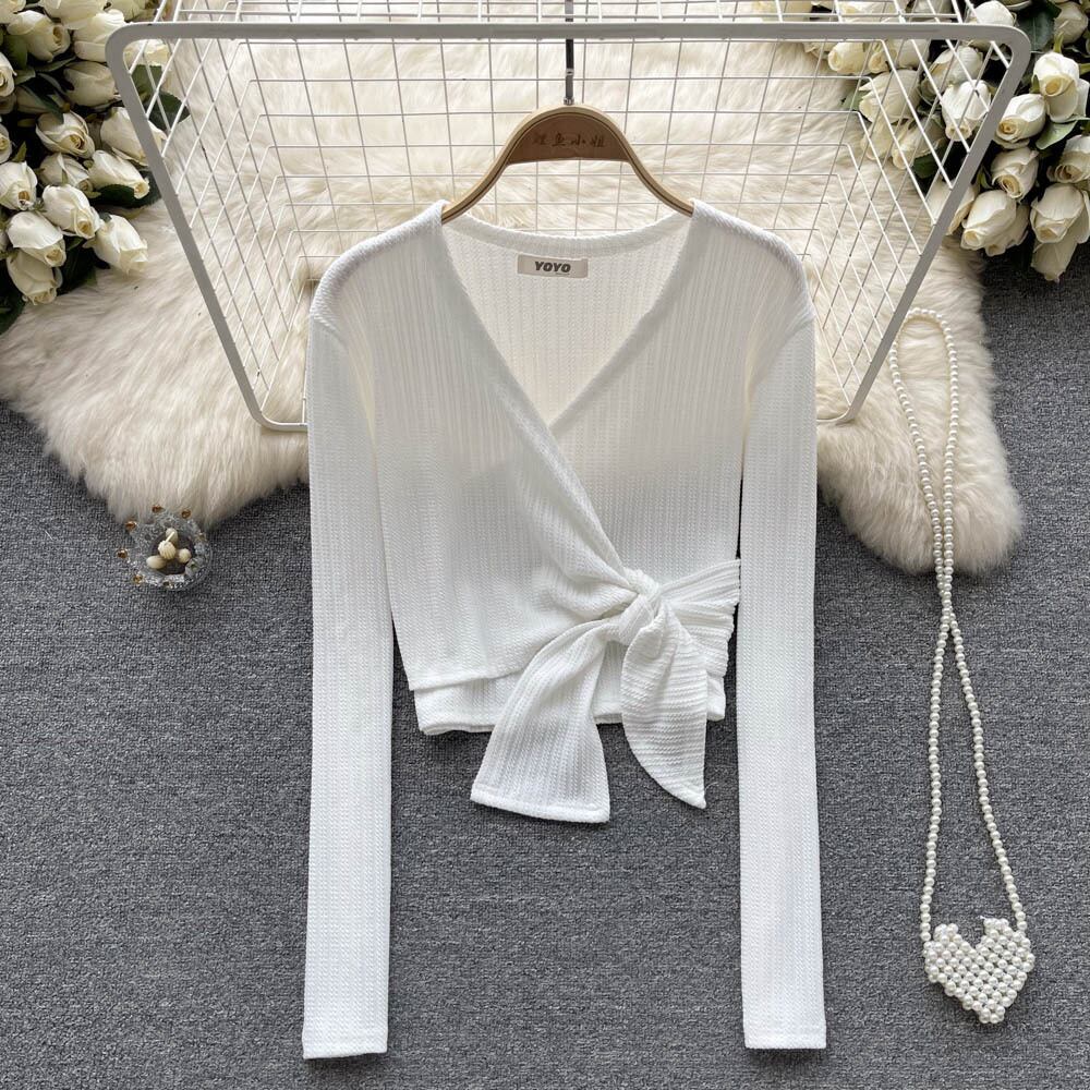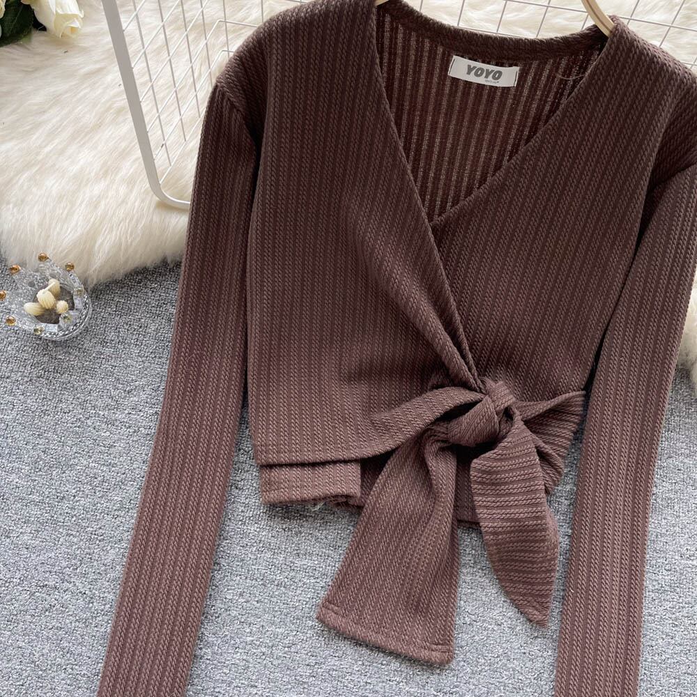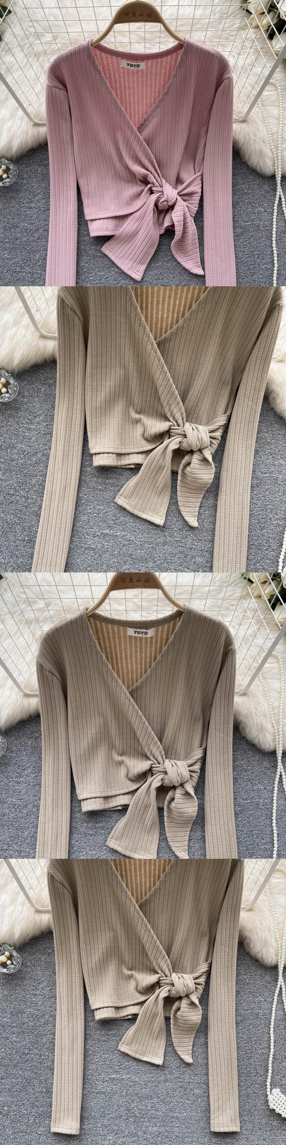 2022秋冬スタイルシックなデザインセンスクロスVネックタイスリム長袖セーターレディースショートニット ロング オータム 秋物 ウィンター 冬物 lyxaj56475493800