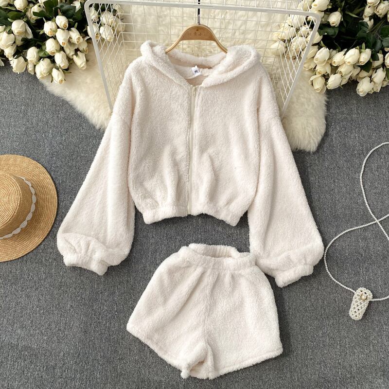 シックなカジュアルな豪華なスーツの女性のルーズ ジッパー ラム ウール フード付きジャケット + ハイ ウエスト ショーツ 2 点セット ハイウェスト ブルマー lyxaj92442123690