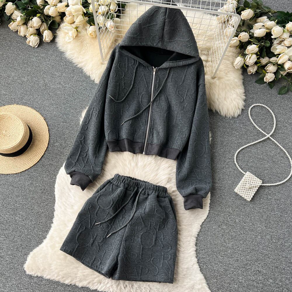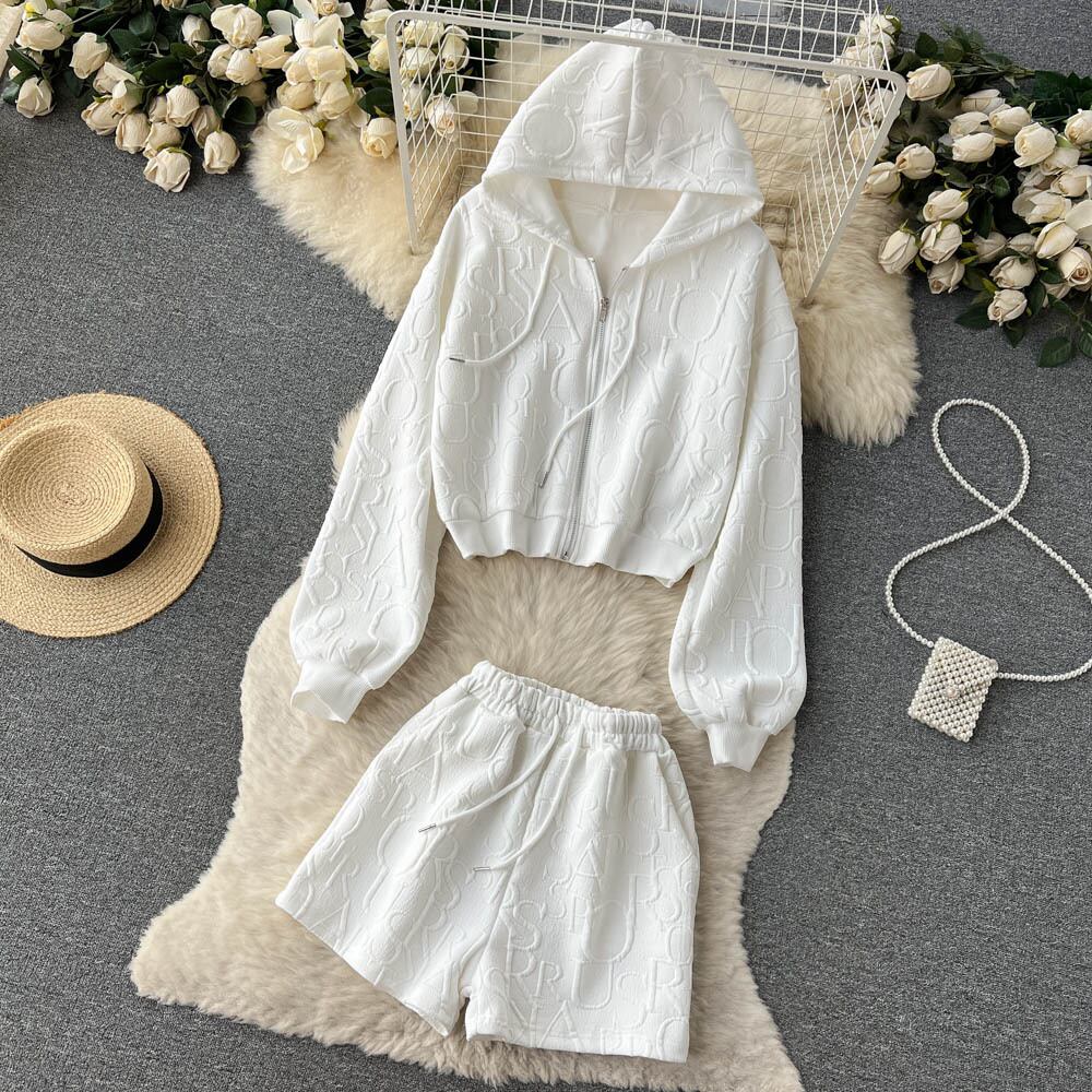 ジャガードカジュアルスポーツスーツレディースゆったりフード付き長袖ショートカーディガンジャケット+ハイウエストショートパンツ2点セット ハイウェスト ロング lyxaj93600456353