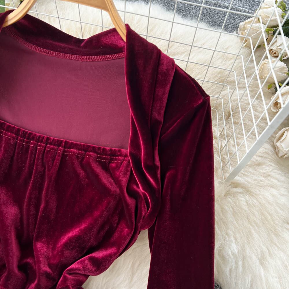 秋と冬の新しいフレンチ スタイルのレトロなスクエア カラー ベルベット ドレス女性ウエスト痩身ビッグ スイング緩い膝丈スカート オータム 秋物 ウィンター 冬物 スクウェア lyxaj19767176690
