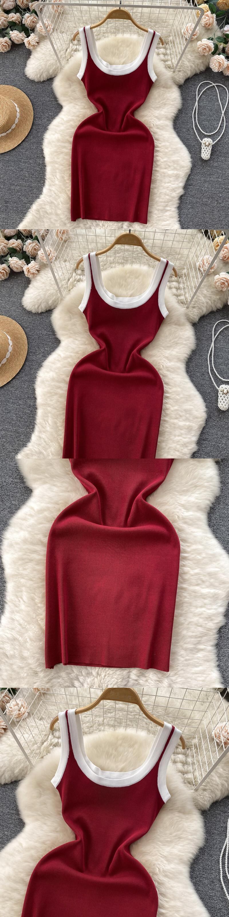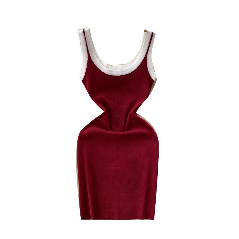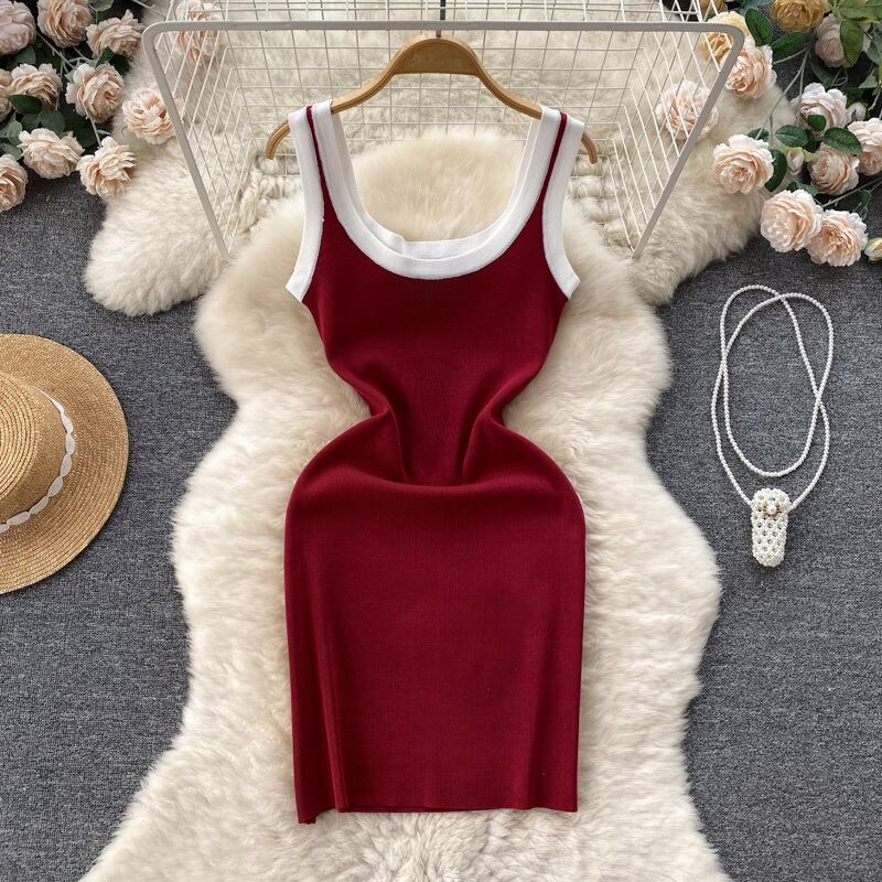 コントラストカラーキャミソールスカートレディースサマー新作スリムミドル丈ノースリーブニットセクシーバッグヒップドレス 夏物 lyxaj39578966666