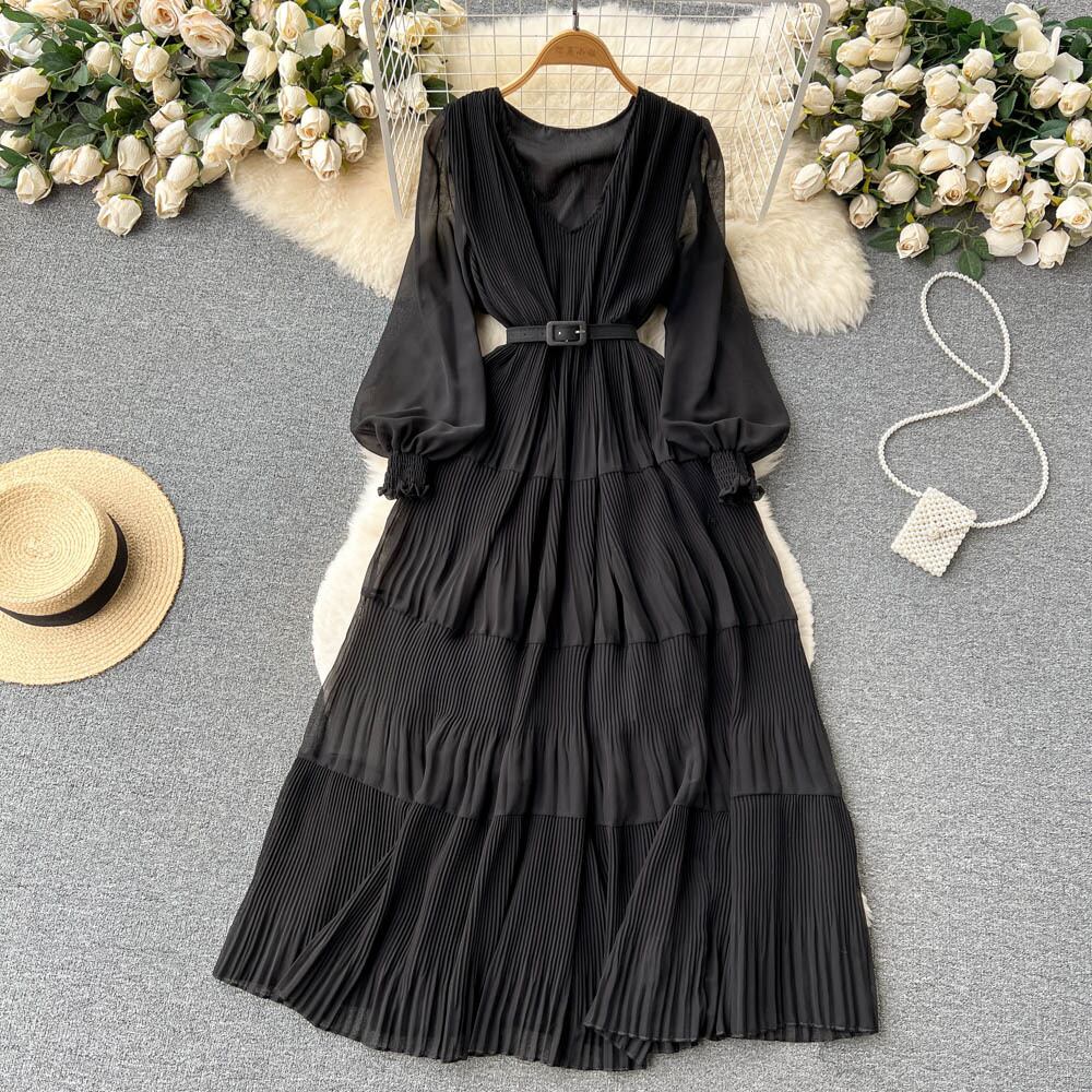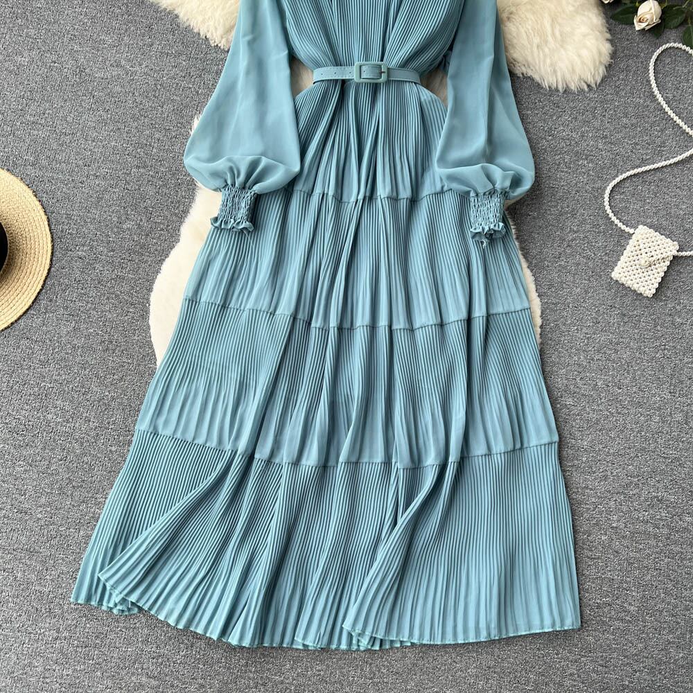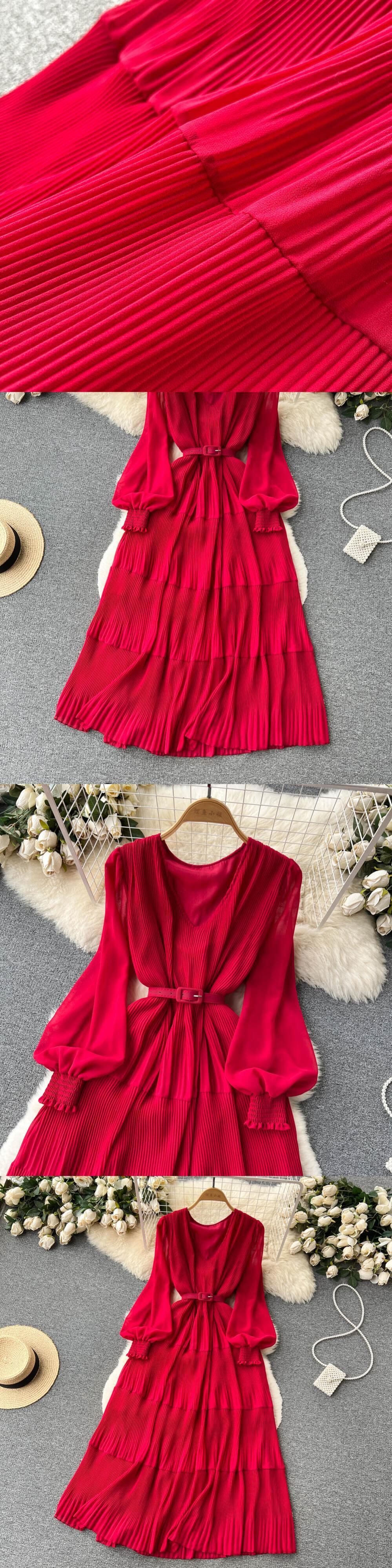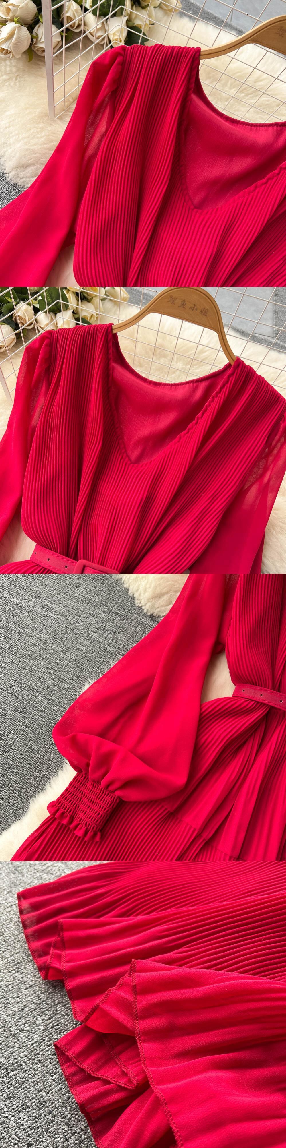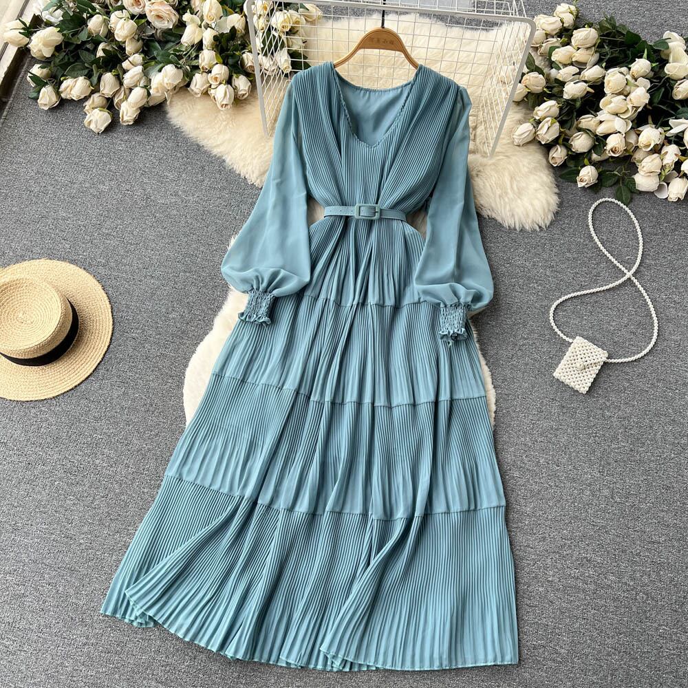 春の新作民族風Vネックパフスリーブウエストワンピース 女らしさ大振りひざ丈ロングスカート トレンド スプリング 春物 lyxaj37132308465