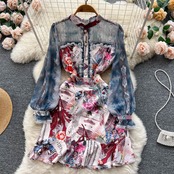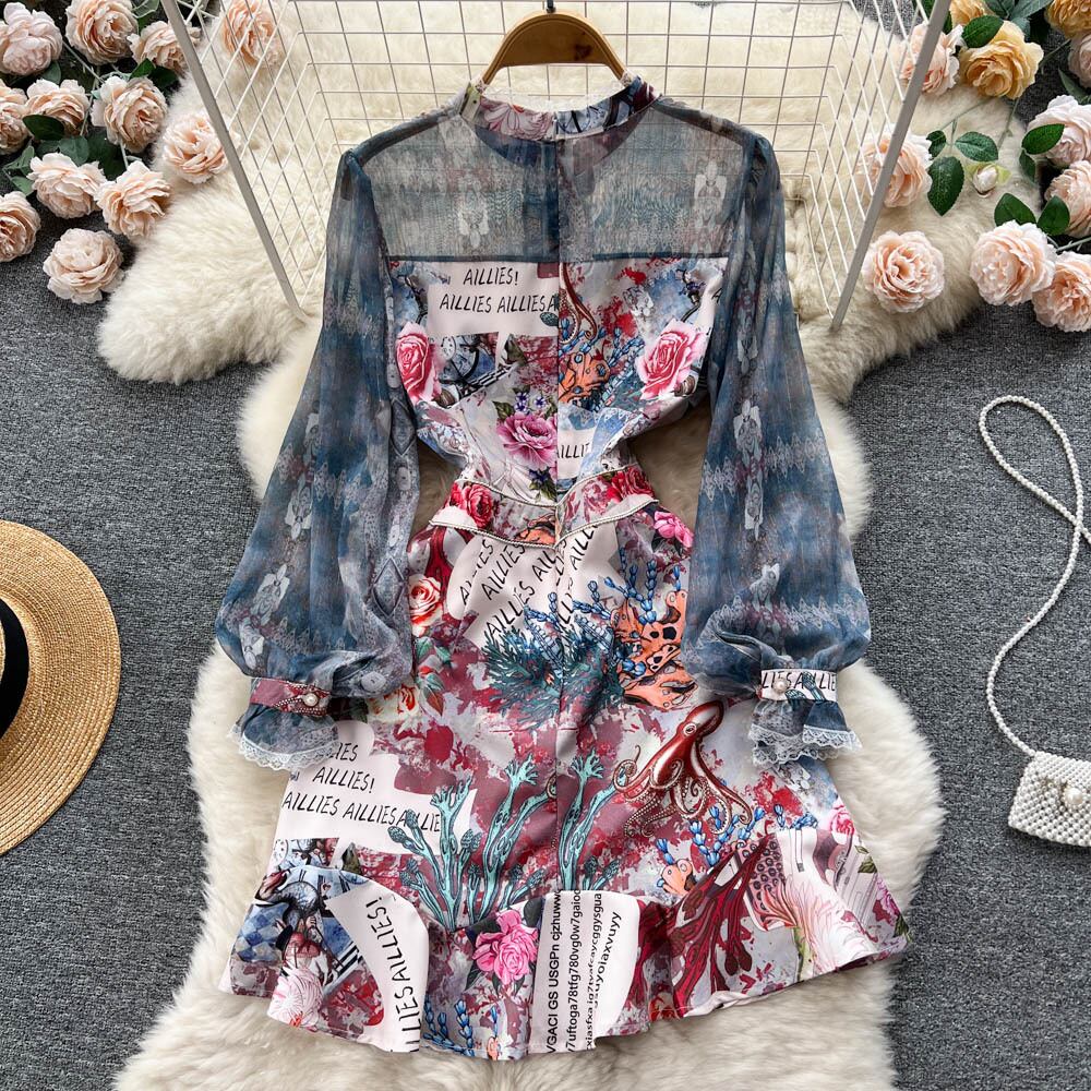 春の新気質セレブウエストレースレースメッシュステッチプリントパフスリーブフィッシュテールドレストレンディ スプリング 春物 lyxaj79584256074