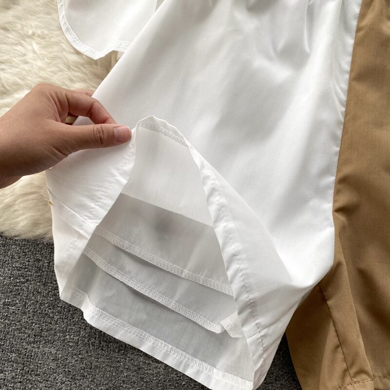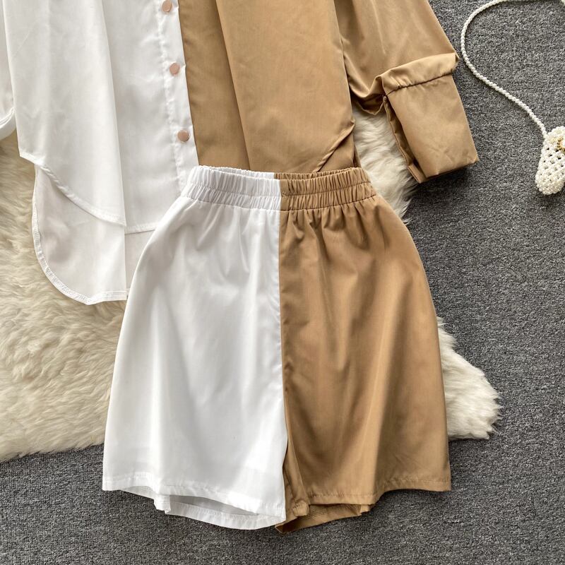 コントラストカラースプライシングスーツレディースカジュアルラペルイレギュラールーズシャツ+ゴムウエストワイドレッグショーツ2点セット秋 エラスティック 伸縮 オータム 秋物 ブルマー lyxaj78056946405