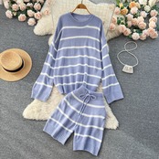シックな秋冬のカラーコントラストストライプスーツの女性の怠惰なスタイルのルーズニットセーター+カジュアルな5点式パンツのツーピーススーツ オータム 秋物 ウィンター 冬物 lyxaj37502147327