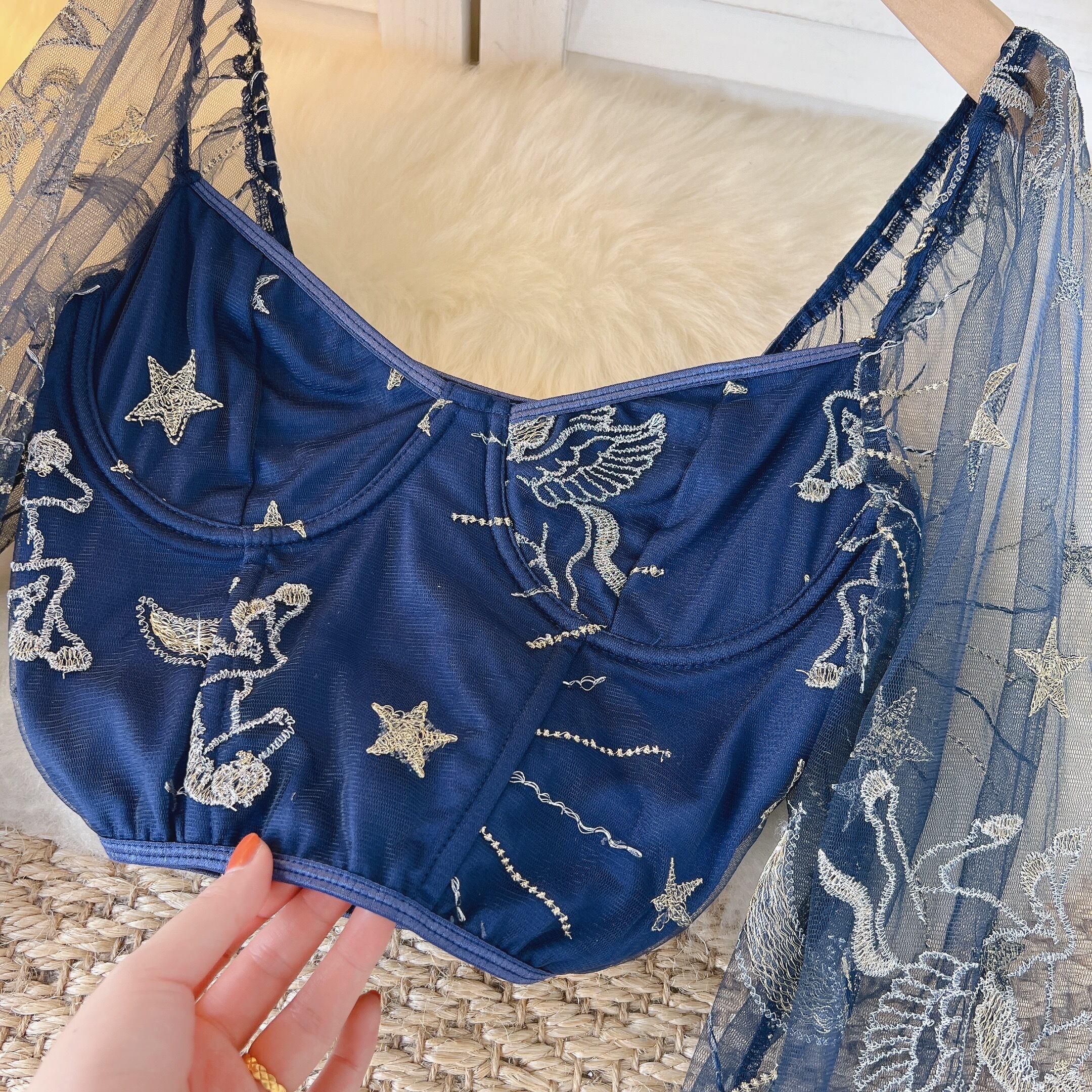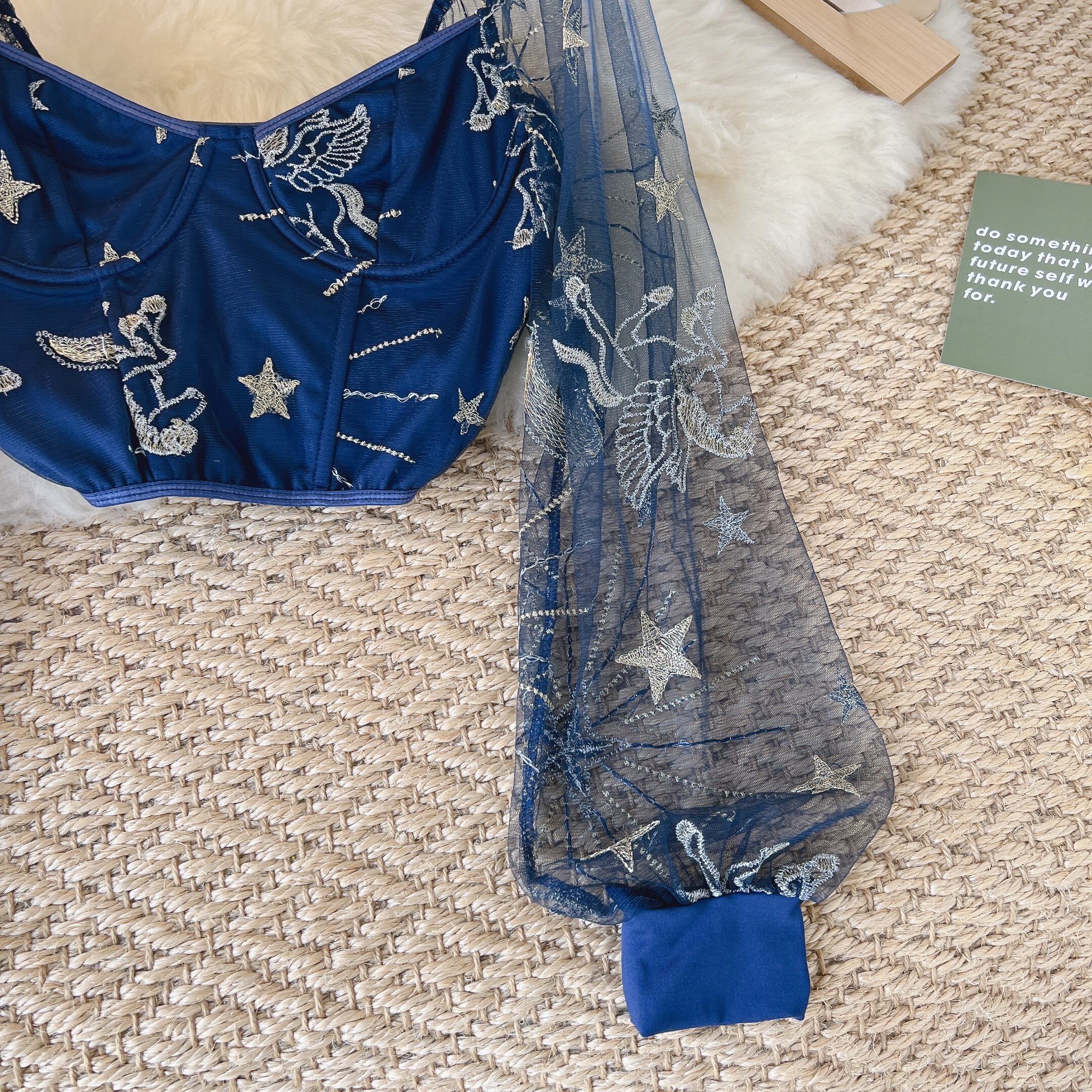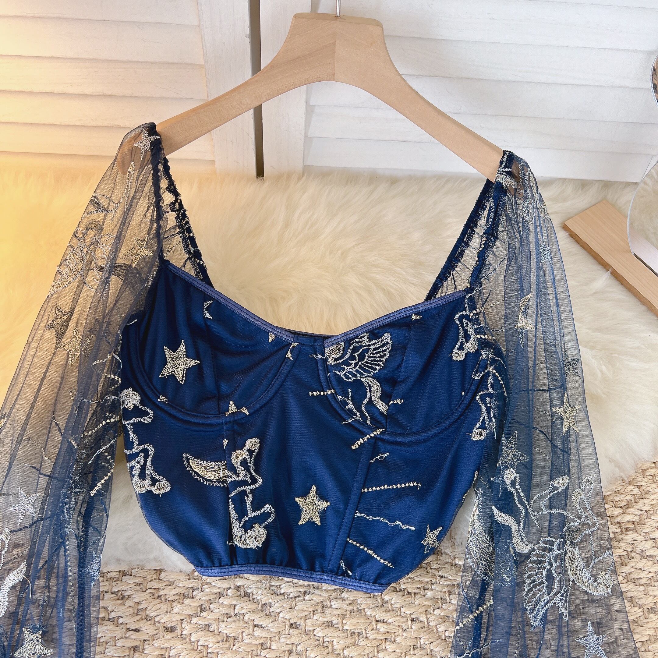 ホットデザインセンスニッチスクエアカラートップ秋の新しいセクシーなショートメッシュ刺繍プリントステッチレースシャツ オータム 秋物 スクウェア lyxaj13111678582