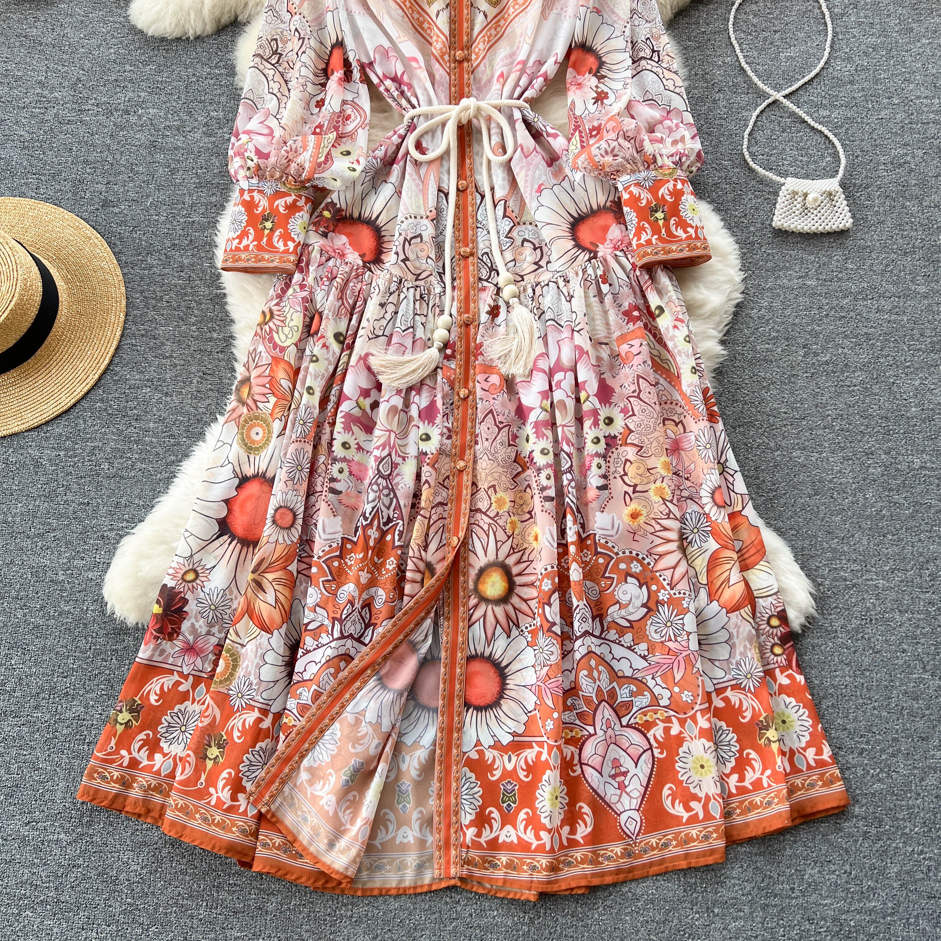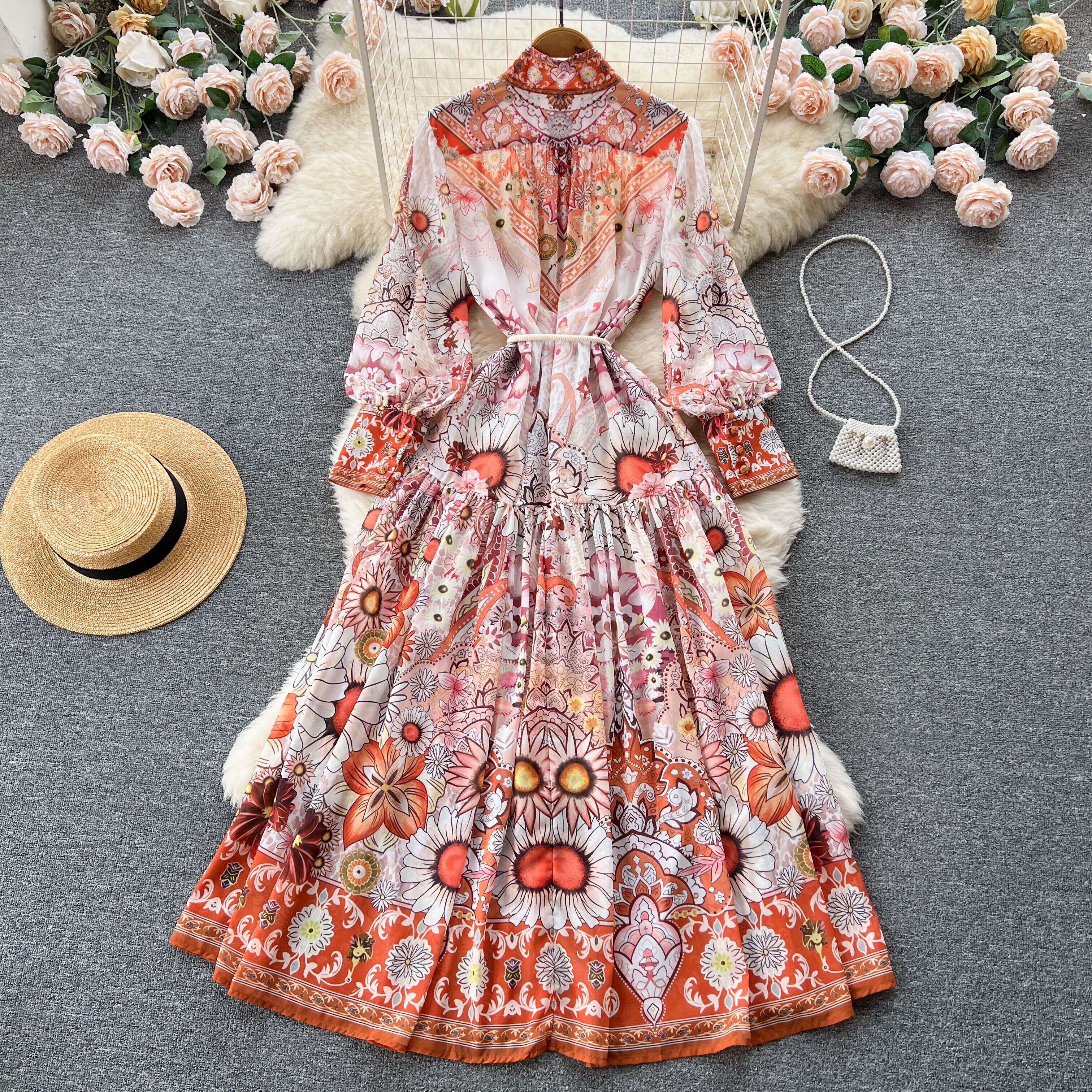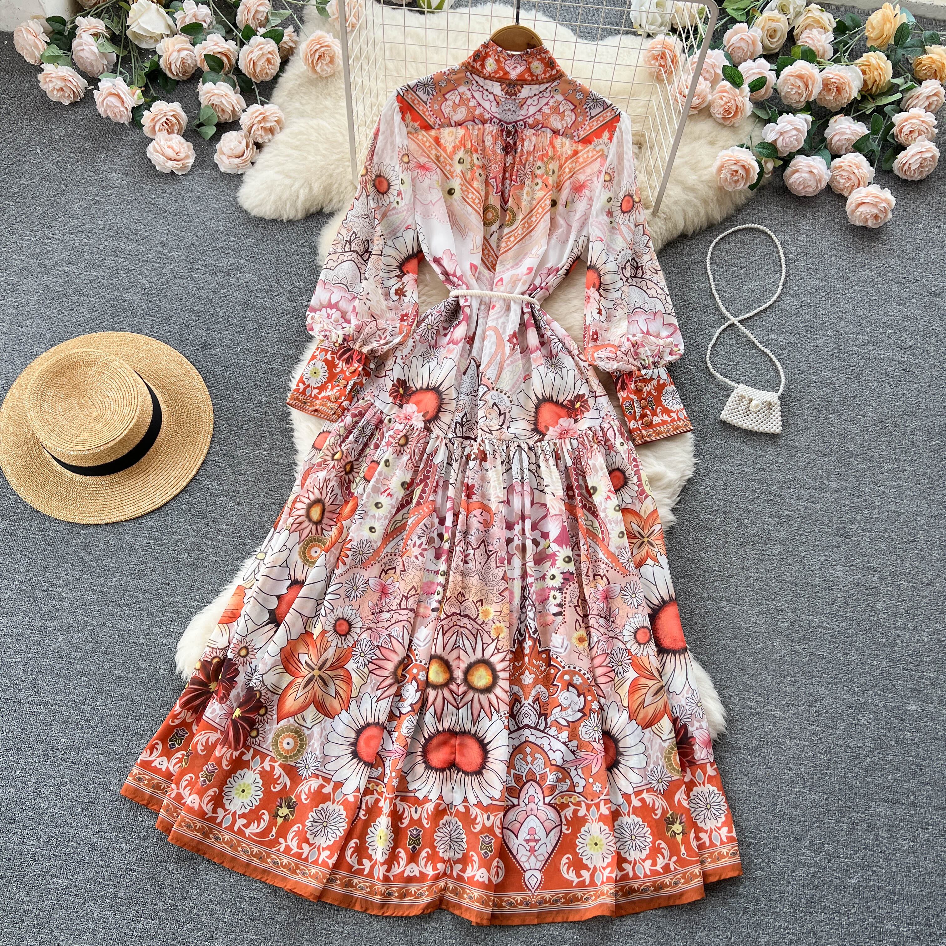 2022 秋の新レトロ全国裁判所スタイルスタンドカラー長袖大スイングプリントドレス女性の膝丈スカート ロング オータム 秋物 lyxaj60737687797