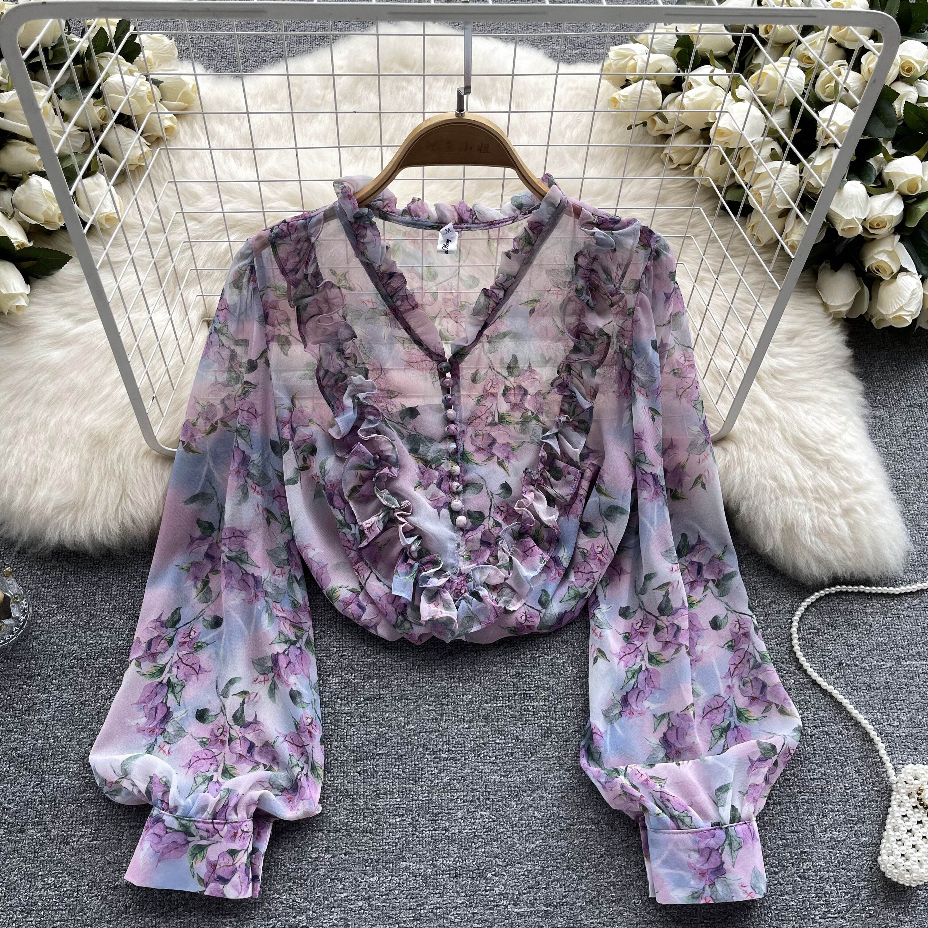 -エンド ニッチ デザイン蓮の葉エッジ プリント ランタン スリーブ シャツ トップ秋の女性のフレンチ V ネック シフォン シャツ女性 ランタンスリーブ オータム 秋物 Vネック lyxaj70905969235