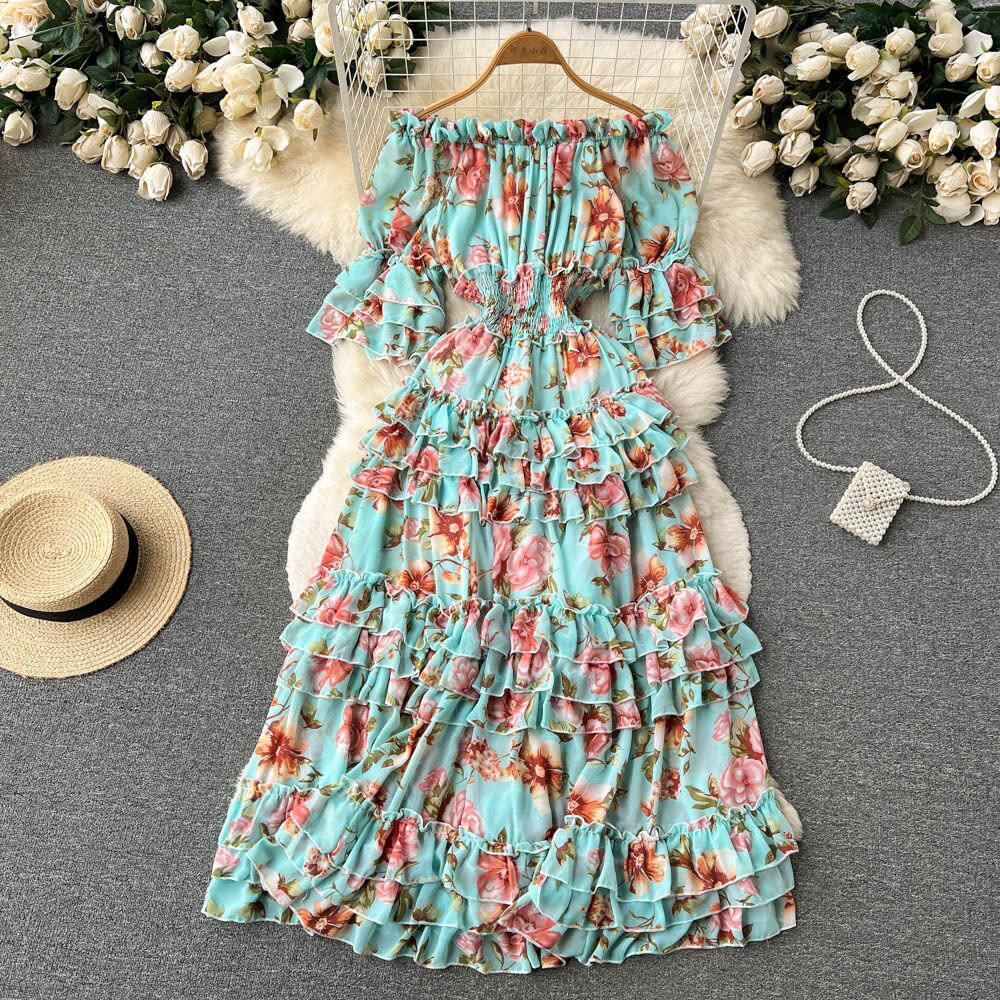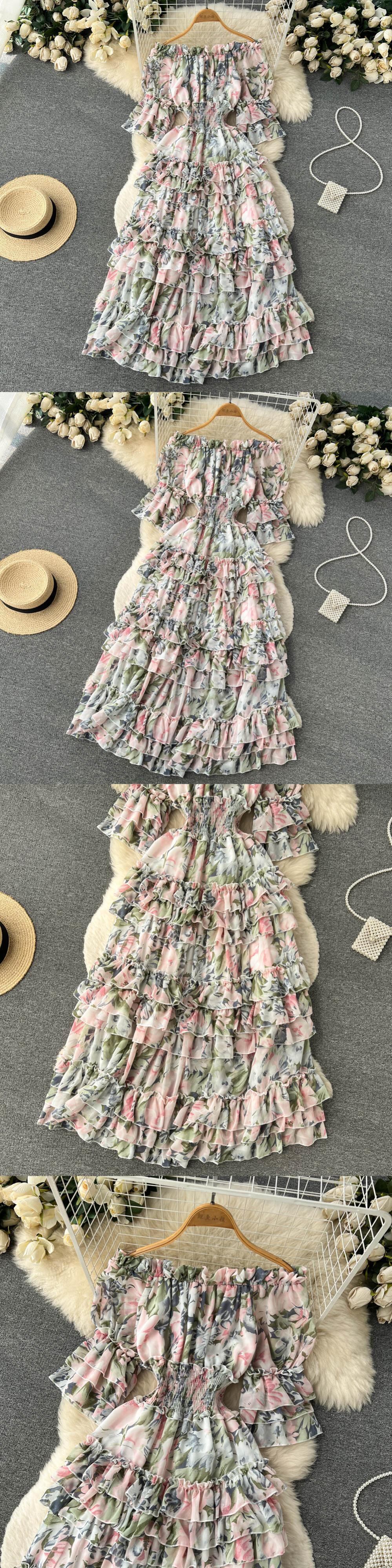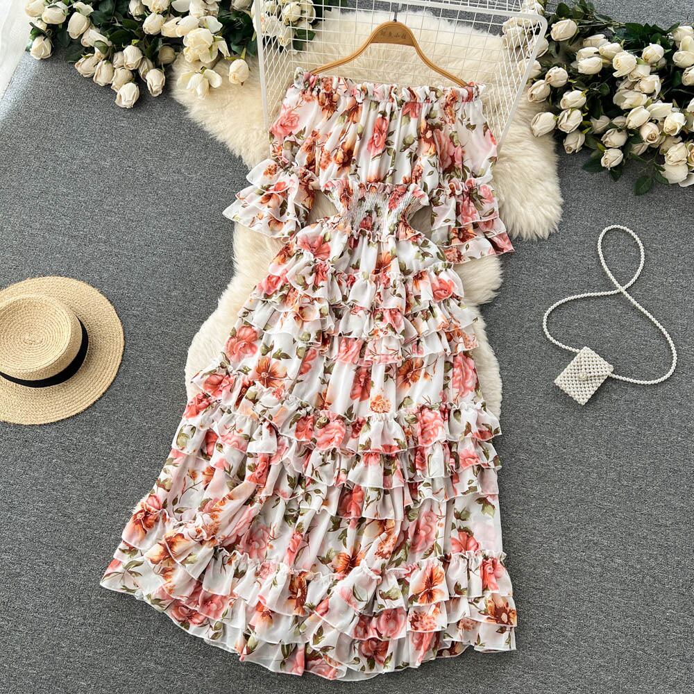 夏の新しいスタイルの甘くて優しいスタイルのワンショルダーフローラルフレンチレトロ痩身ケーキスカートビッグスイングドレス 大人ガーリー スウィート キュート カジュアル サマー 夏物 花柄 lyxaj90524420331