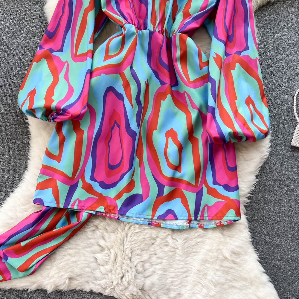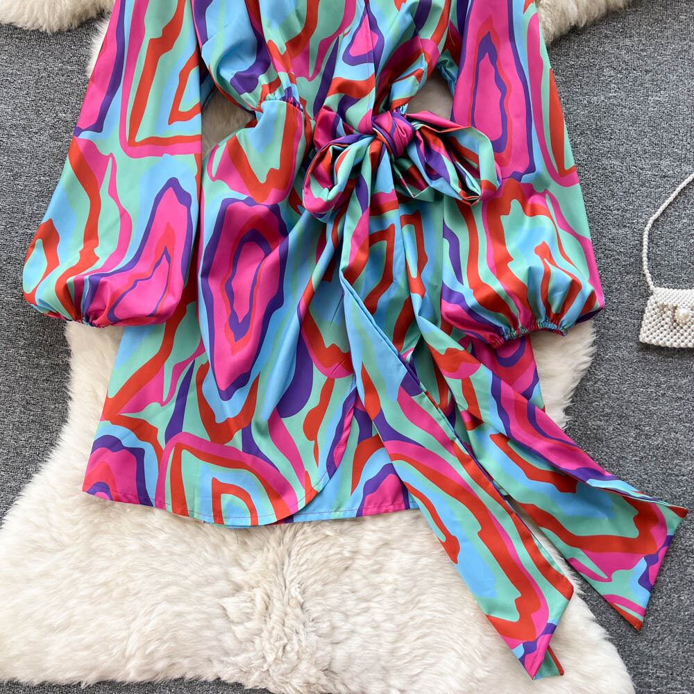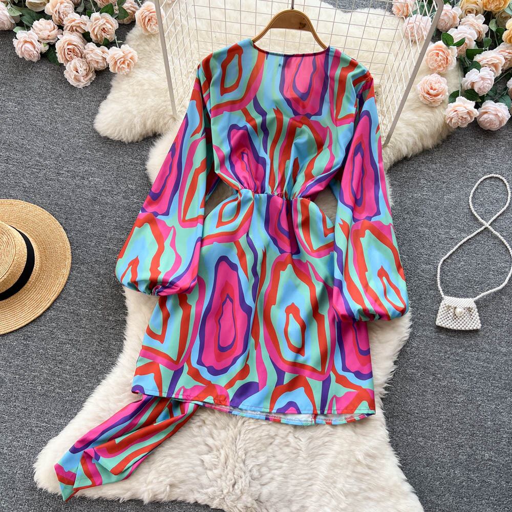 怠惰なスタイルのニッチなデザイン センス プリント ランタン スリーブ ドレス秋の女性のドレス ネクタイ ウエスト V ネック ショート スカート トレンディ ランタンスリーブ オータム 秋物 Vネック lyxaj3127028871