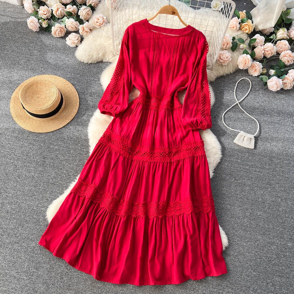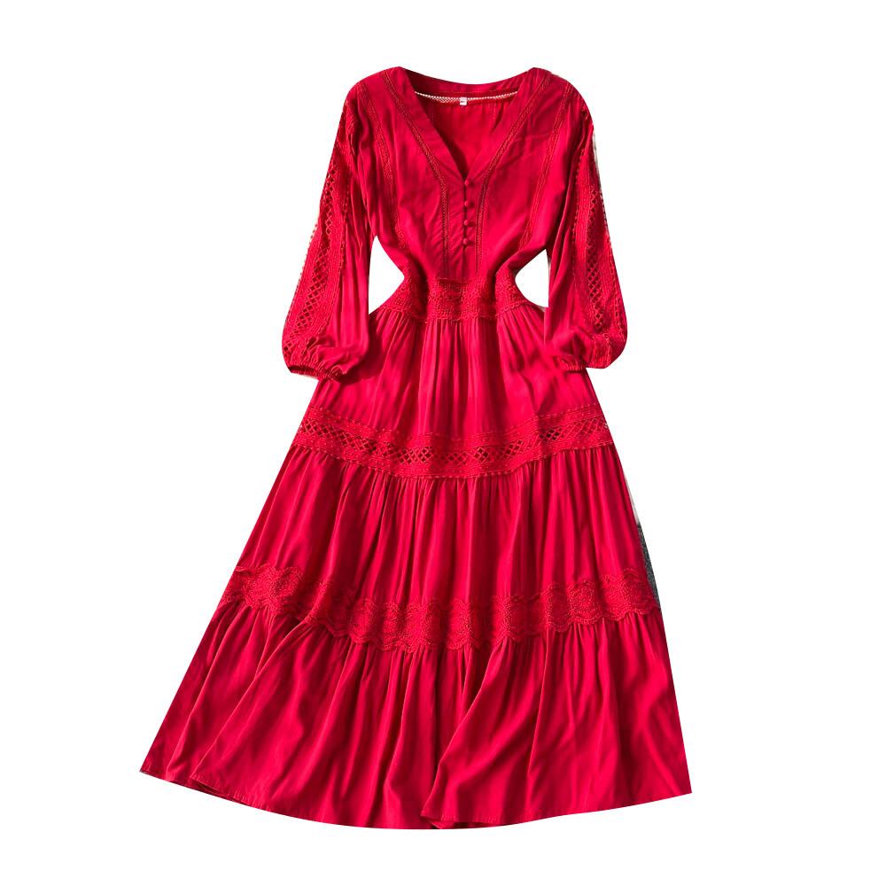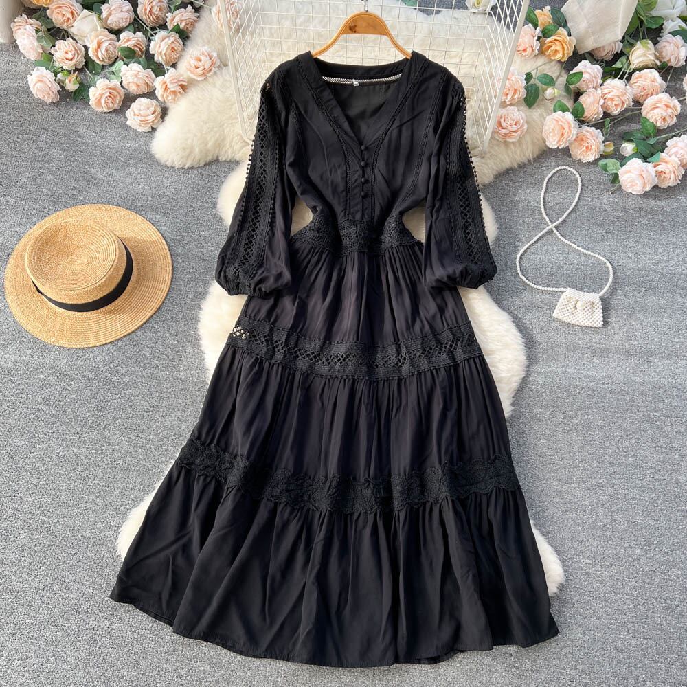 春と秋の V ネック中空レースの気質の自己修養ドレス女性のフレンチ platycodon パフ スリーブ膝上マーメイド ドレス スプリング 春物 オータム 秋物 Vネック lyxaj9214388900