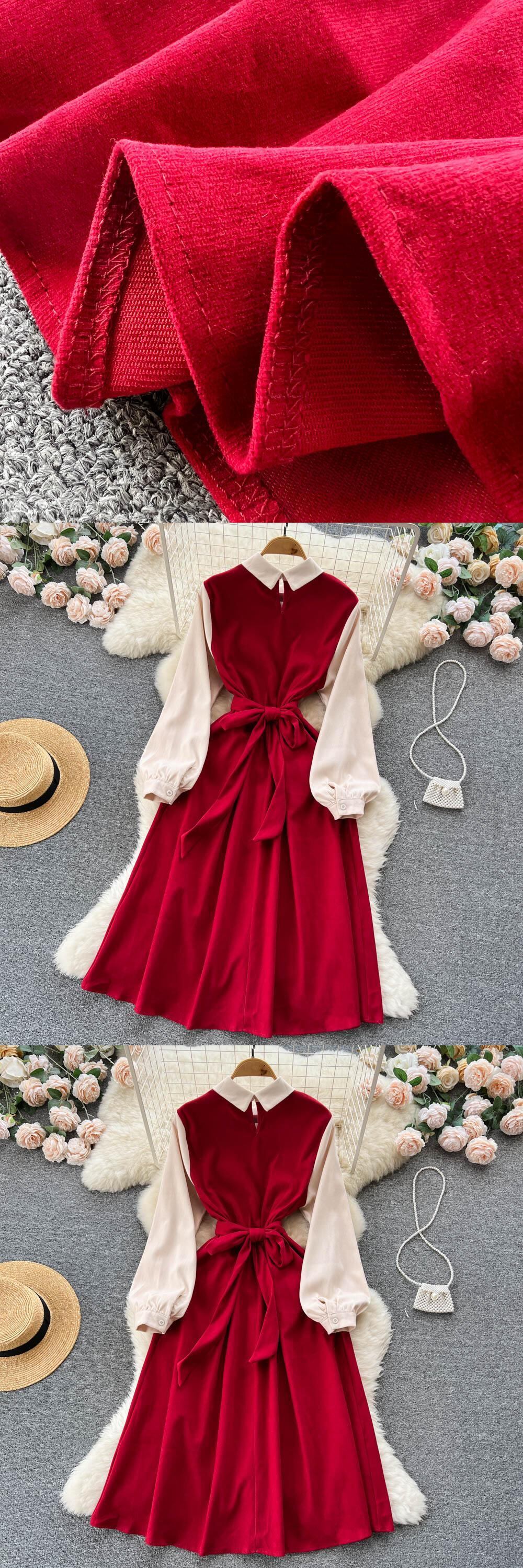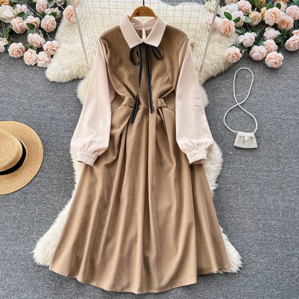 秋の新スタイル ese カレッジ スタイル コントラスト カラー ラペル ボウ ミッドレングス ウエスト ウエスト スイング 膝丈 Aライン ドレス リボン オータム 秋物 lyxaj34924899235
