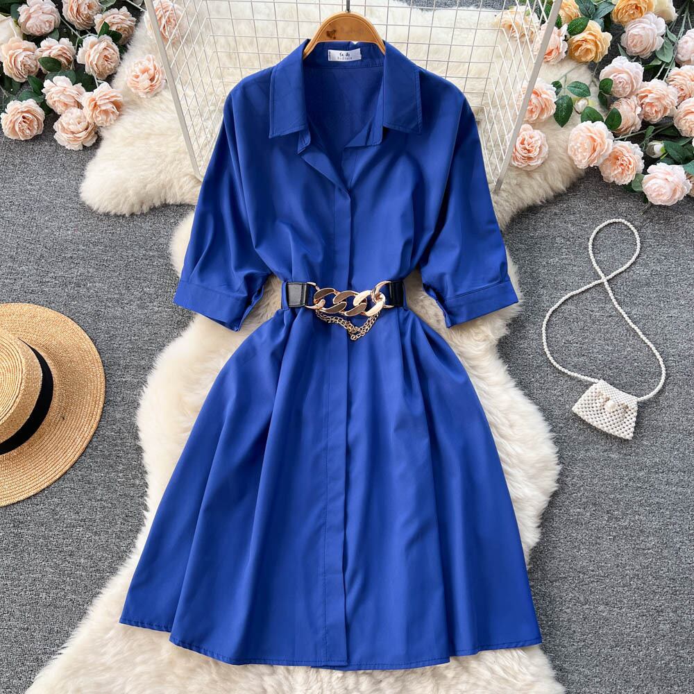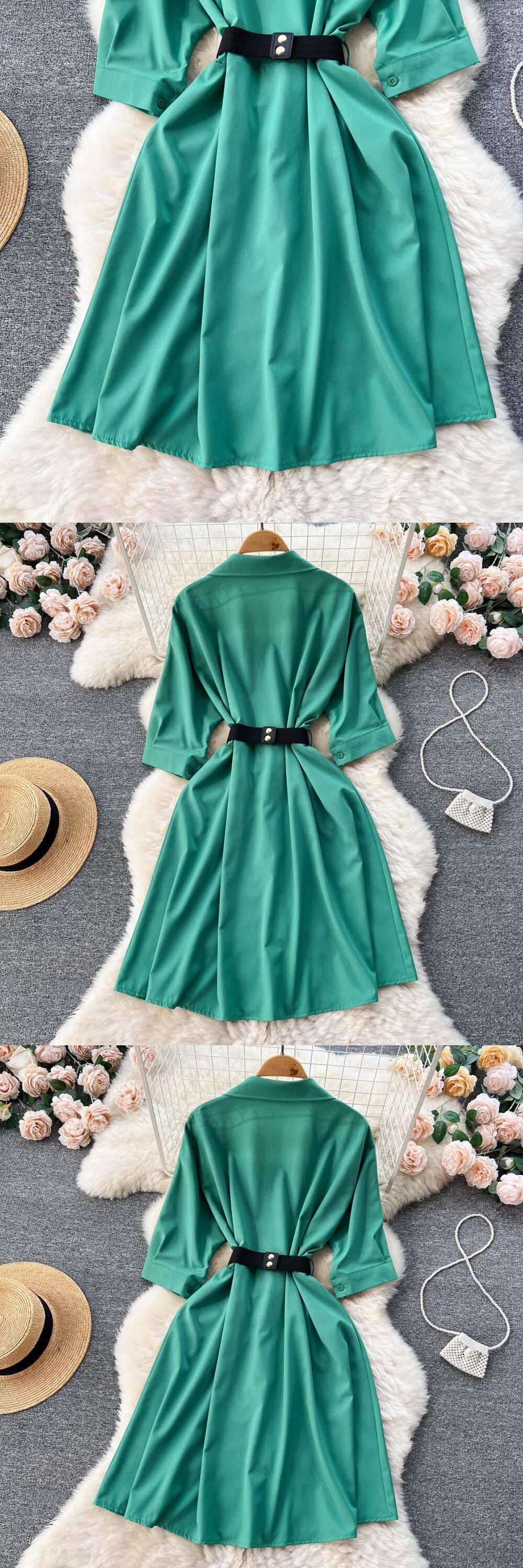 春夏新作 無地 ラペルウエスト シックなスカート レディース 五分袖 ミドル丈 Aライン シャツワンピース トレンド スプリング 春物 サマー 夏物 ソリッドカラー lyxaj10791782231