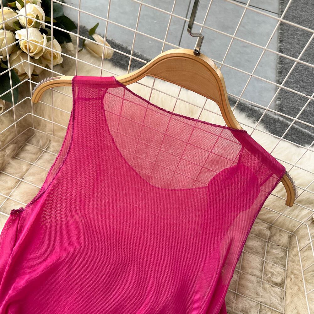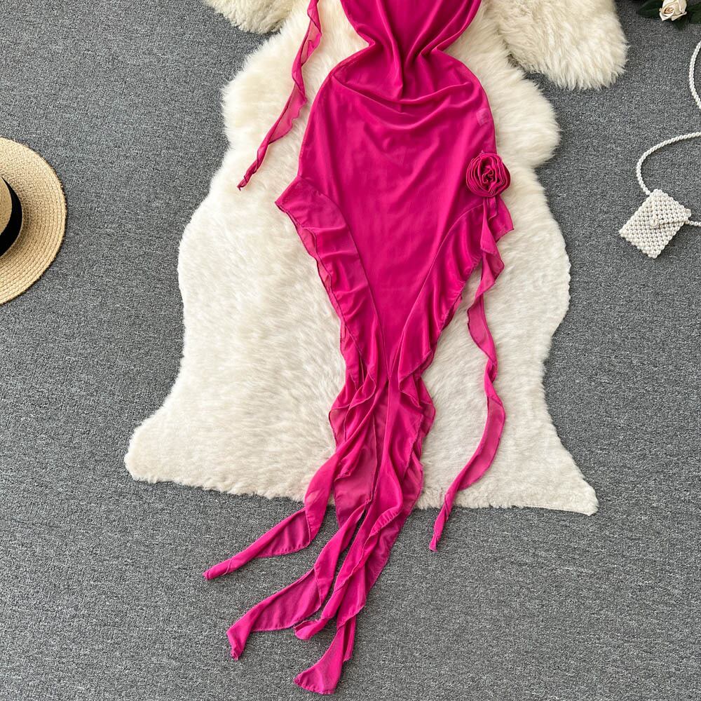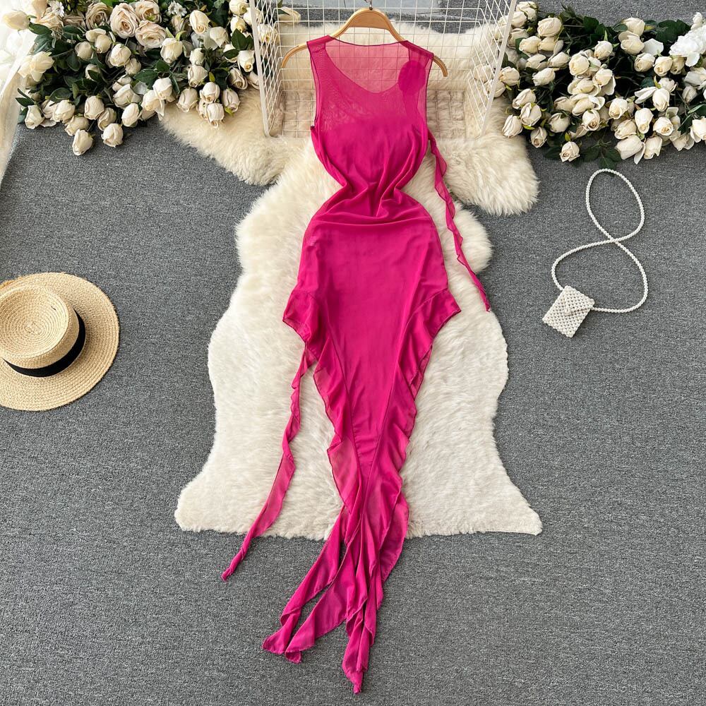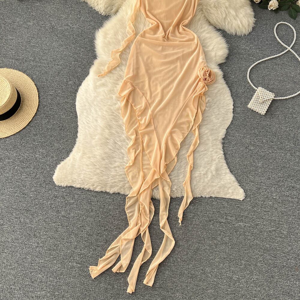 ヨーロッパとアメリカのセクシーなデザインの立体フラワー ノースリーブ スリム フィット バッグ ヒップ イレギュラー フリル メッシュ ドレス フラワーデザイン ヨーロピアン lyxaj59389470164