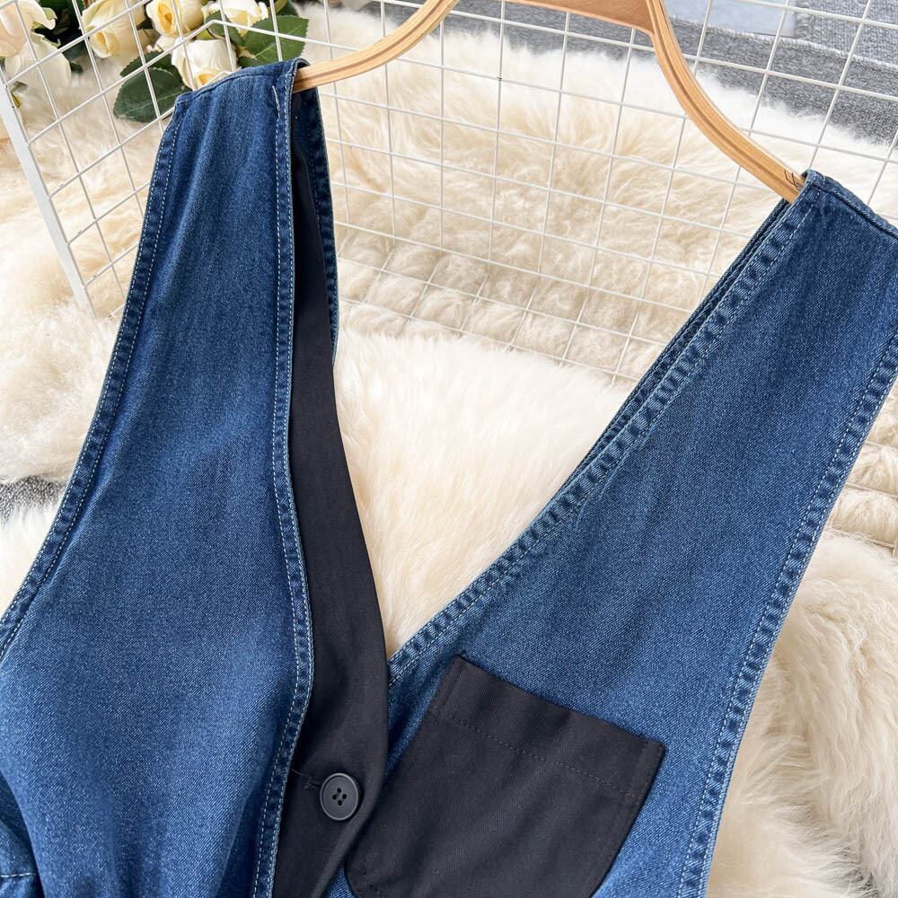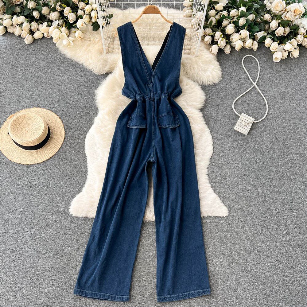 センスニッチオープンバックデニムサスペンダージャンプスーツ女性 2022 夏新ネクタイウエスト V ネックジャンプスーツ サマー 夏物 Vネック lyxaj7515051770