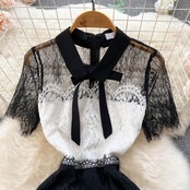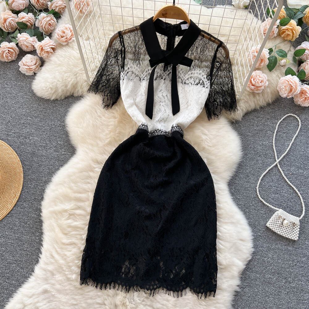 新デザインセンス半袖気質自己修養バッグヒップレディース黒と白のステッチレース薄いセクシーなドレスのバージョン ホワイト ブラック lyxaj82391753405