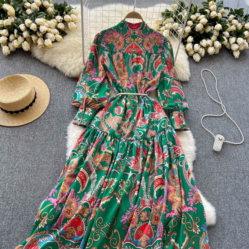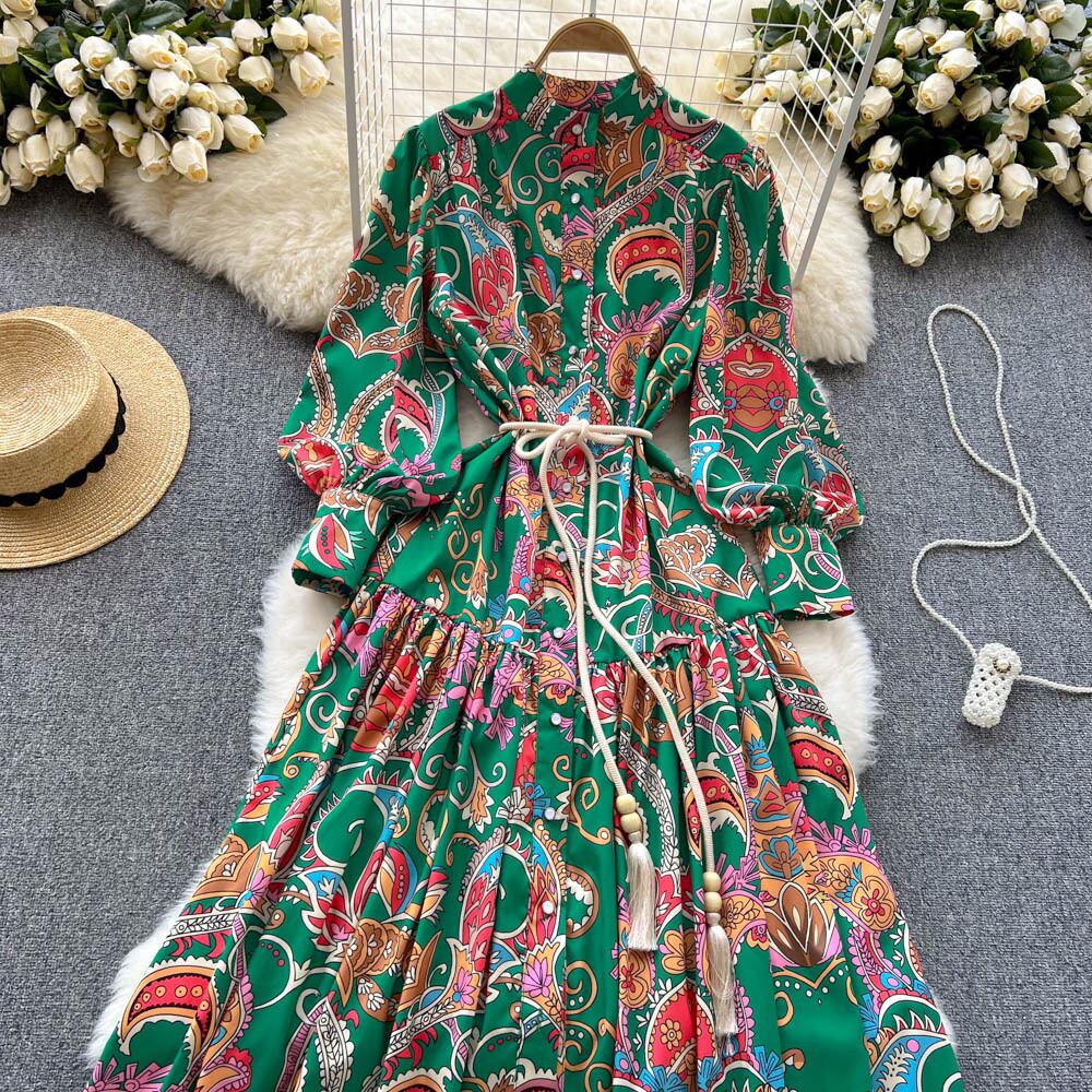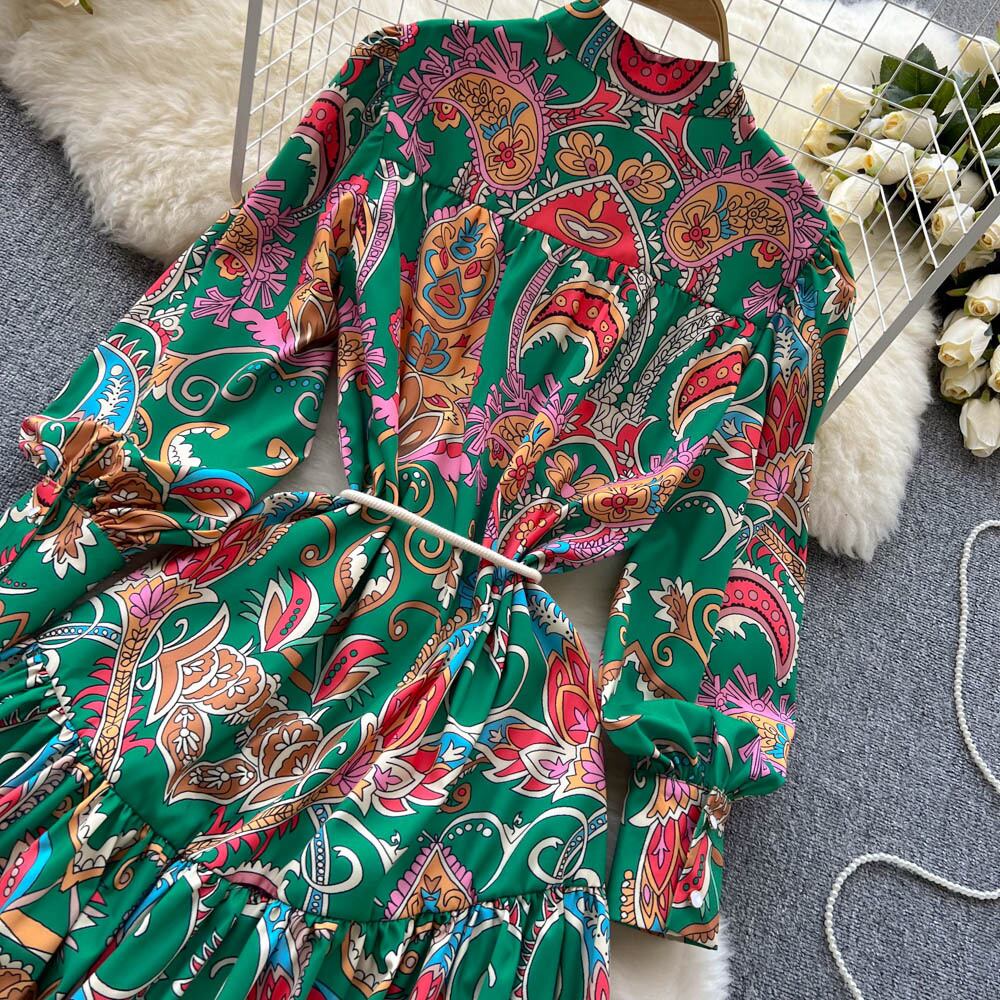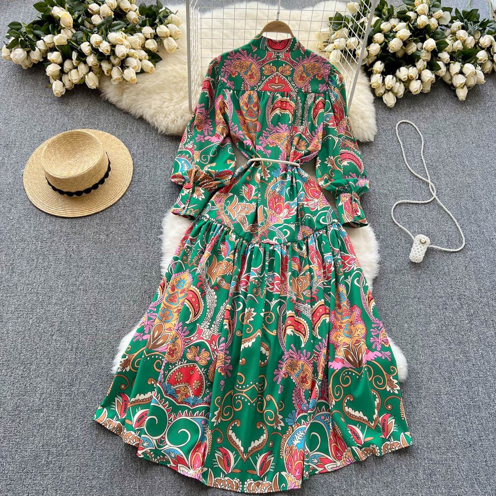 2022 秋の新フレンチコートスタイルレトロスタンドカラーパフスリーブプリントドレスと大スイングプリーツロングスカート オータム 秋物 lyxaj47190489872