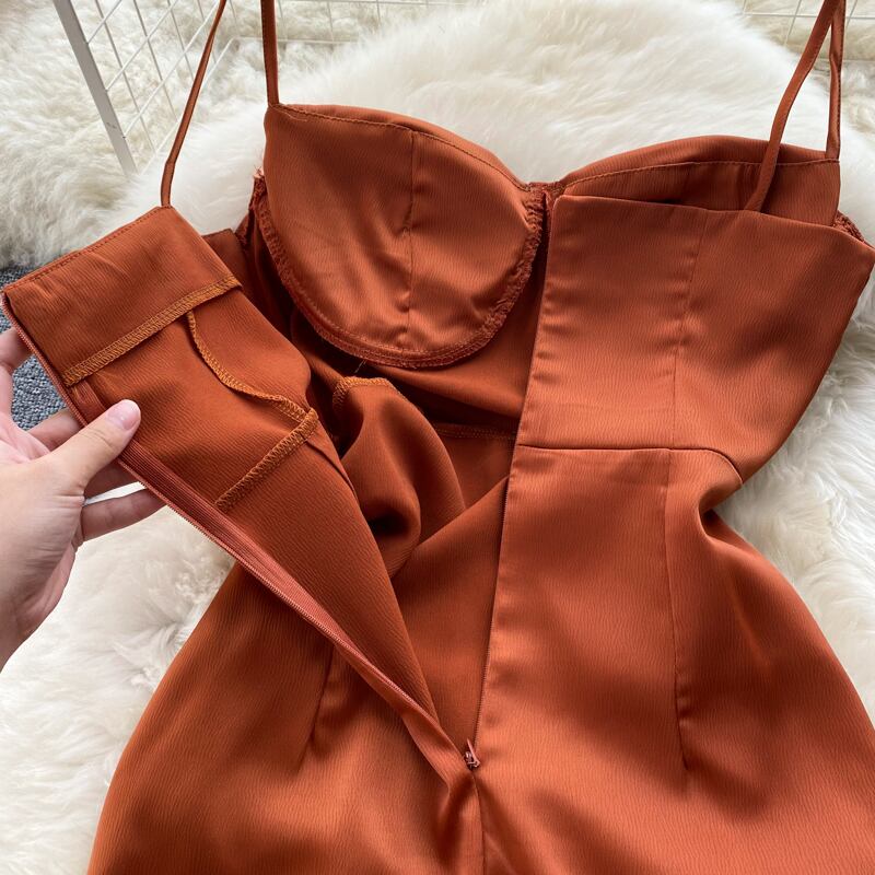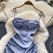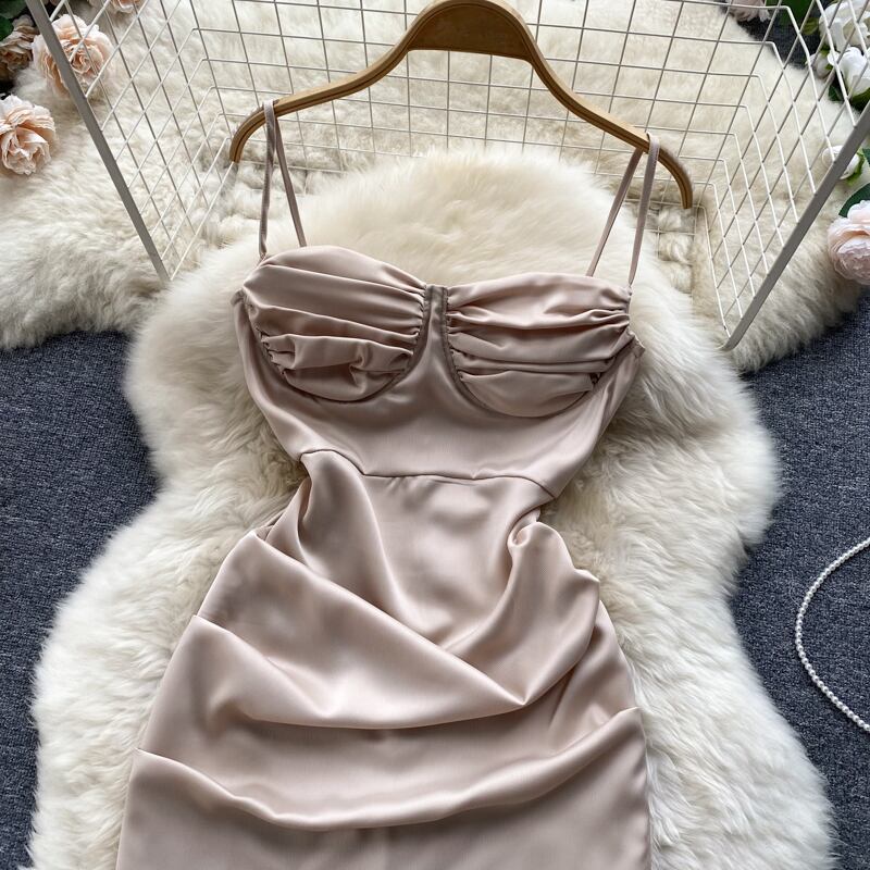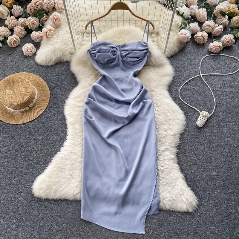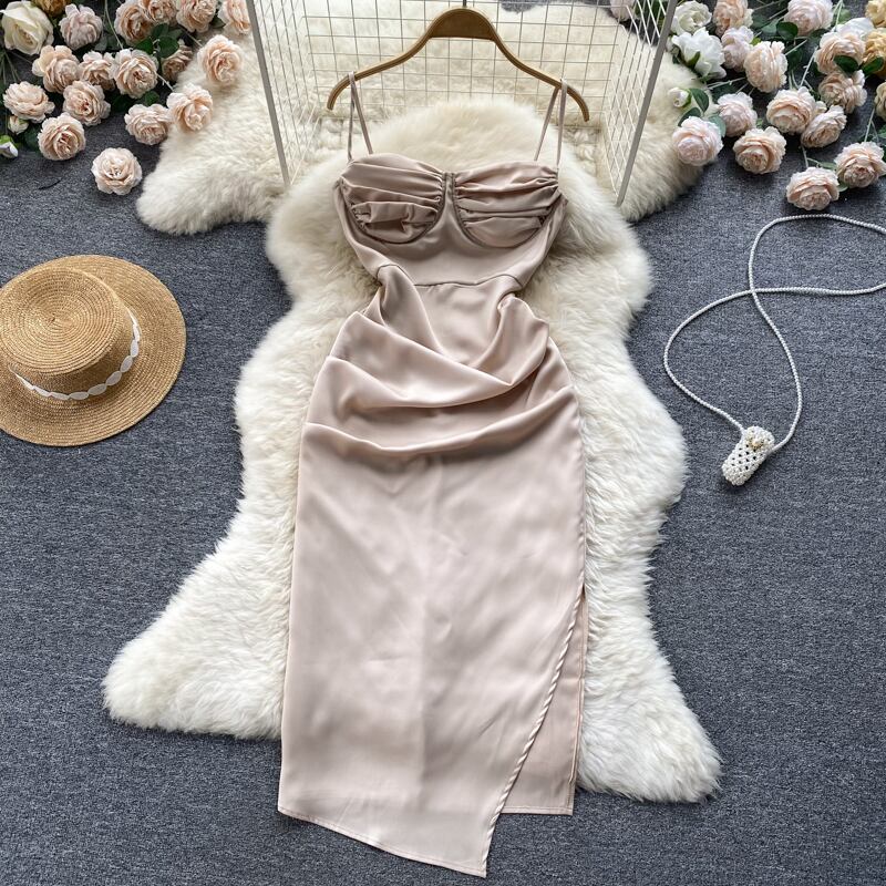 フレンチレトロな雰囲気のサテンサスペンダースカートレディースライトラグジュアリースリットイレギュラースイングカラープリーツセクシードレス潮 lyxaj82863332317