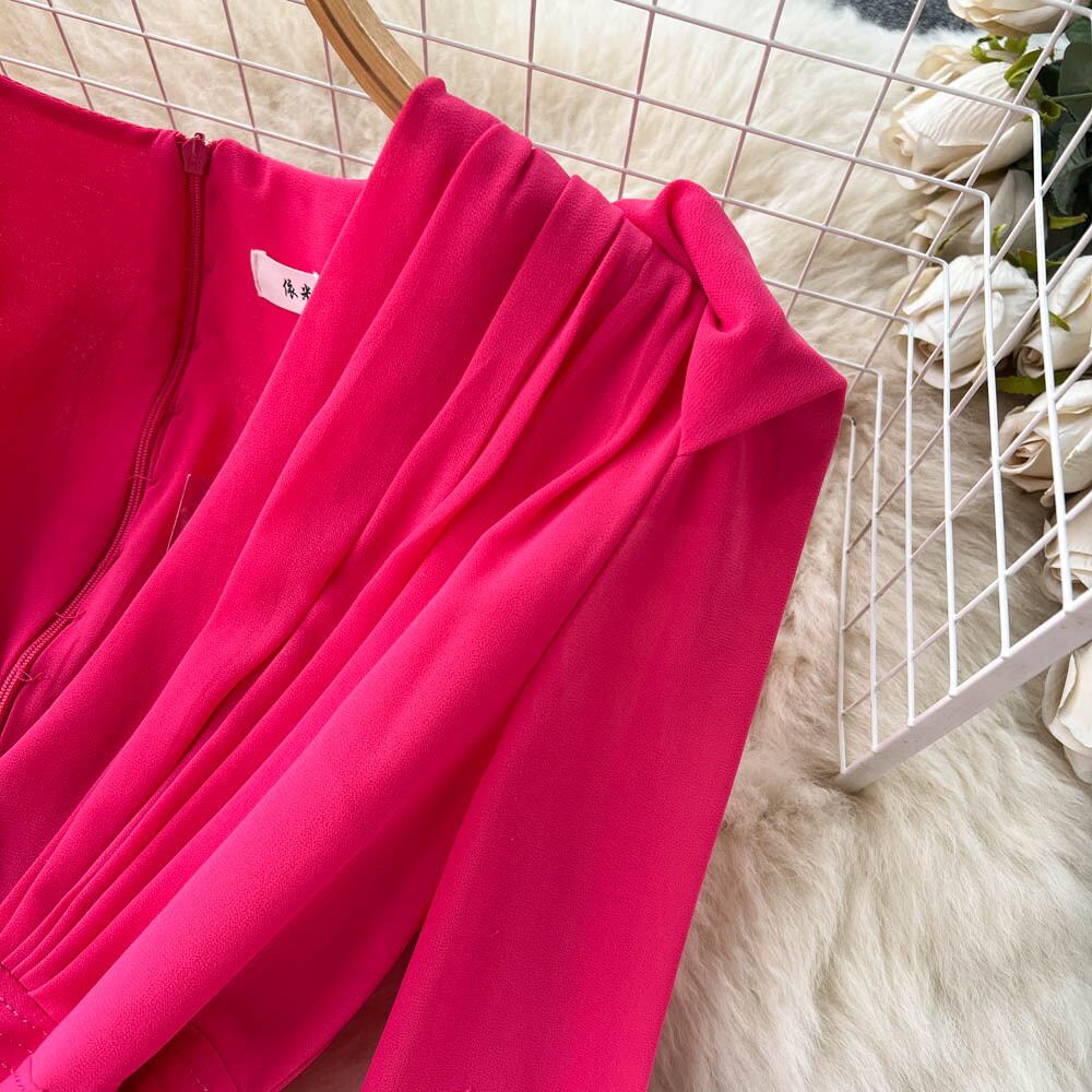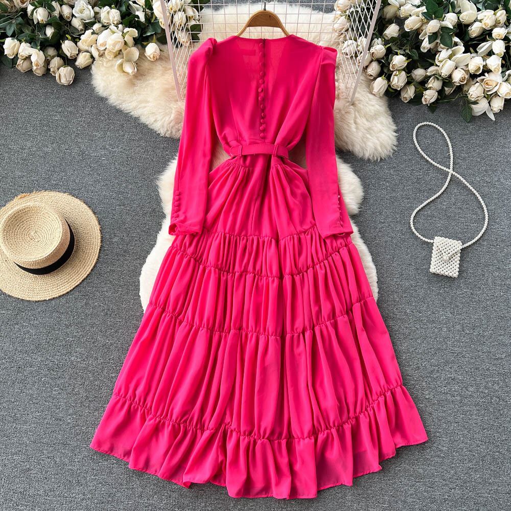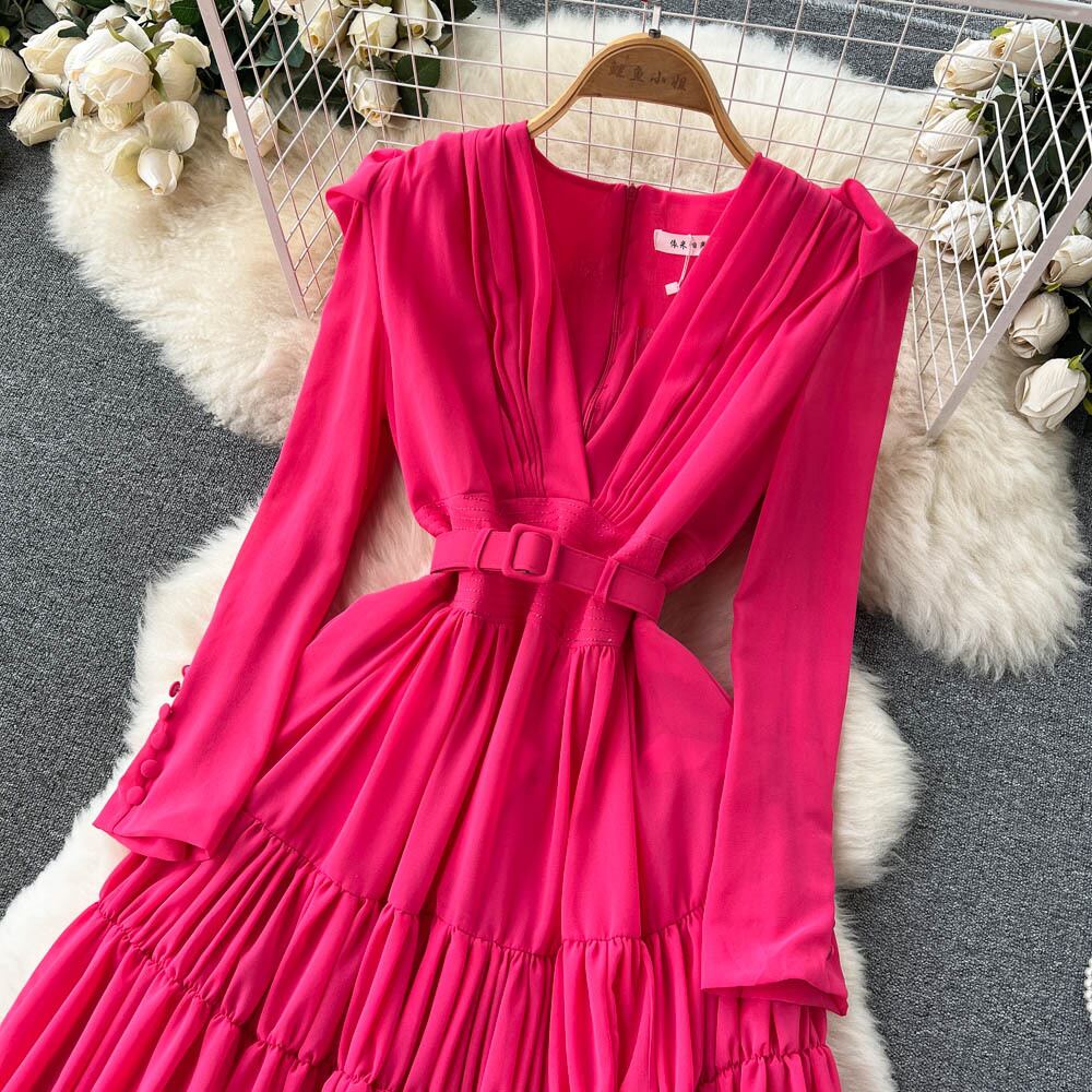 -エンドウエストラインとスリムな気質の長袖ドレス秋の女性のフレンチスタイルの美しいVネックプリーツAラインドレス ロング オータム 秋物 lyxaj15526901007