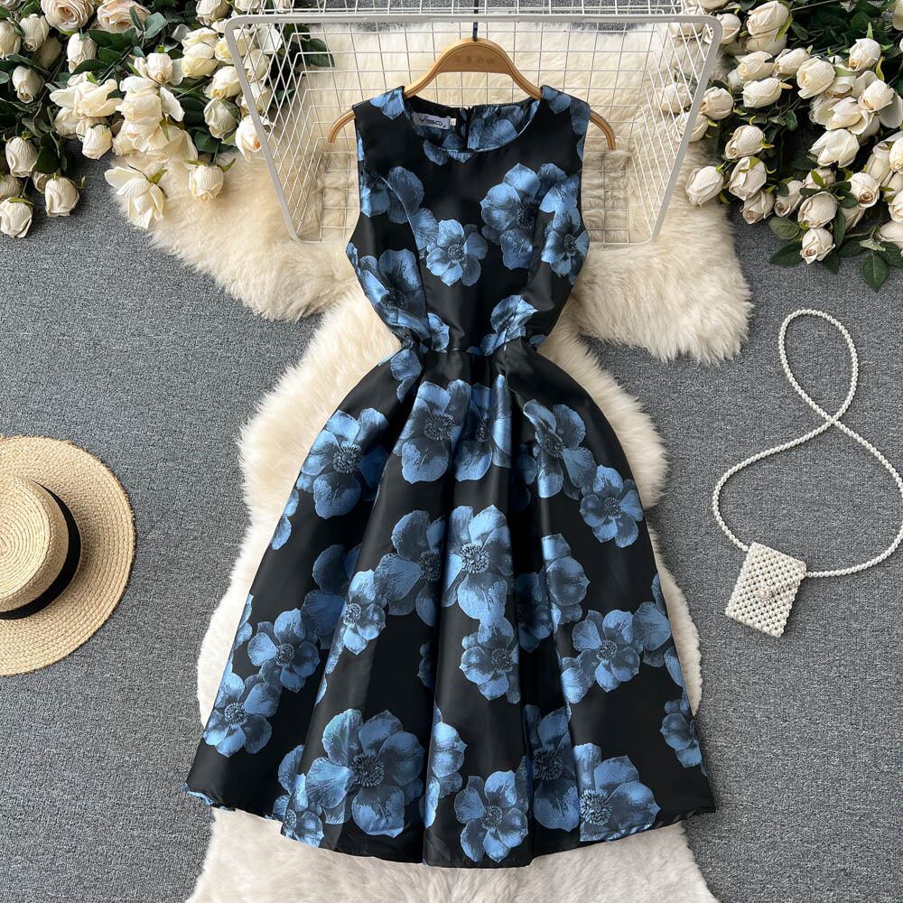 春と夏の新しいヨーロッパとアメリカの休日のスタイルの気質スリム ウエスト プリント ノースリーブ ベスト ジャカード A ライン ドレス トレンディ スプリング 春物 サマー 夏物 Aライン ヨーロピアン lyxaj45902606339