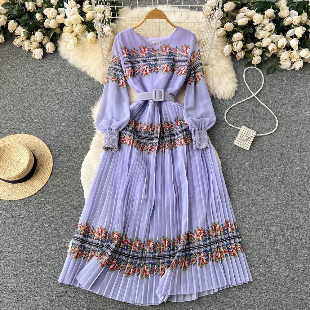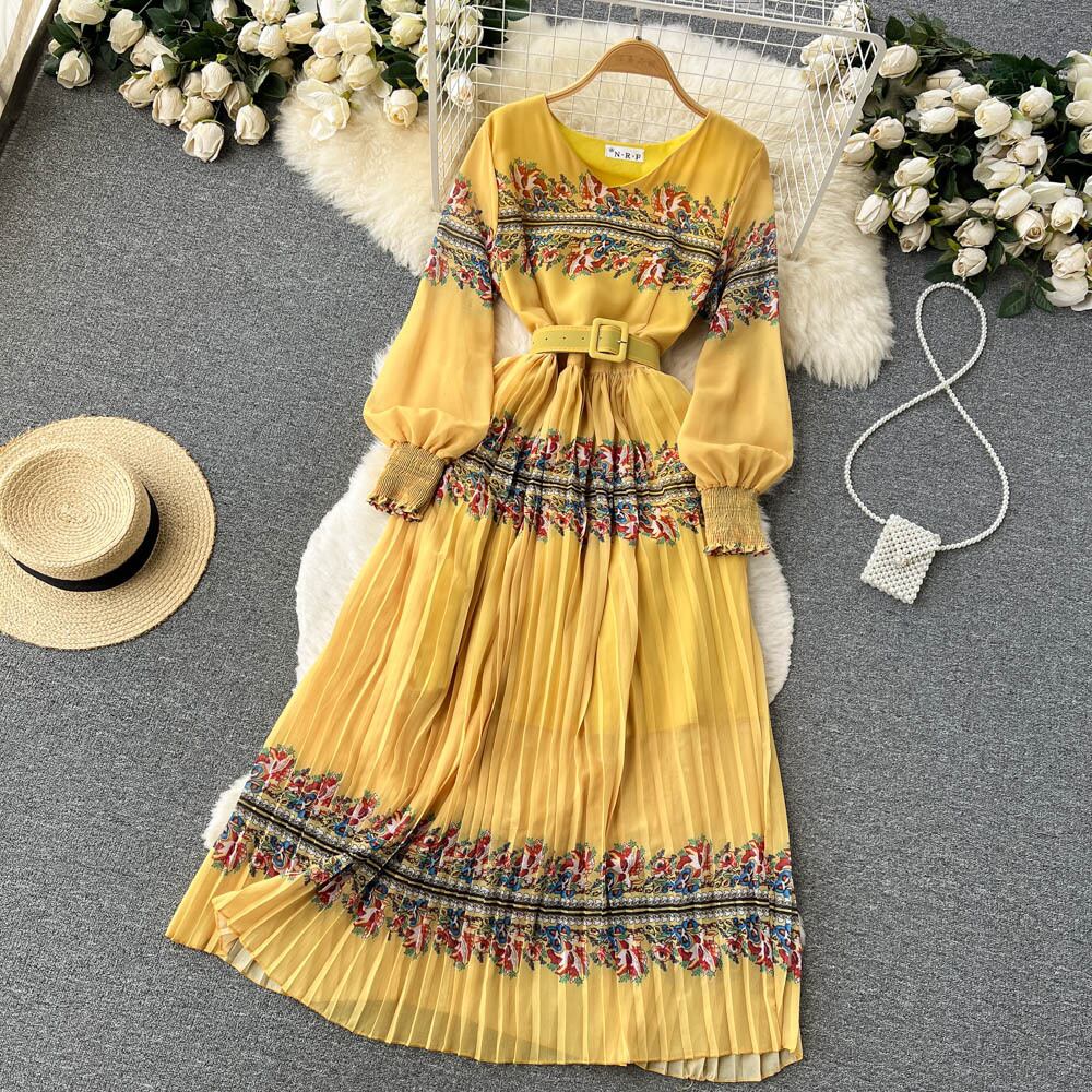 秋の新しいボヘミアン エスニック スタイル大スイング ロング スカート女性重工業プリーツ V ネック ウエスト ホリデー ドレス オータム 秋物 Vネック lyxaj2919078122
