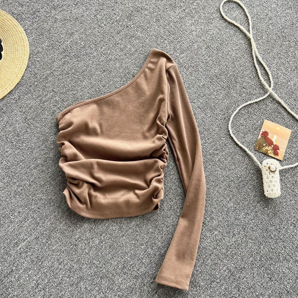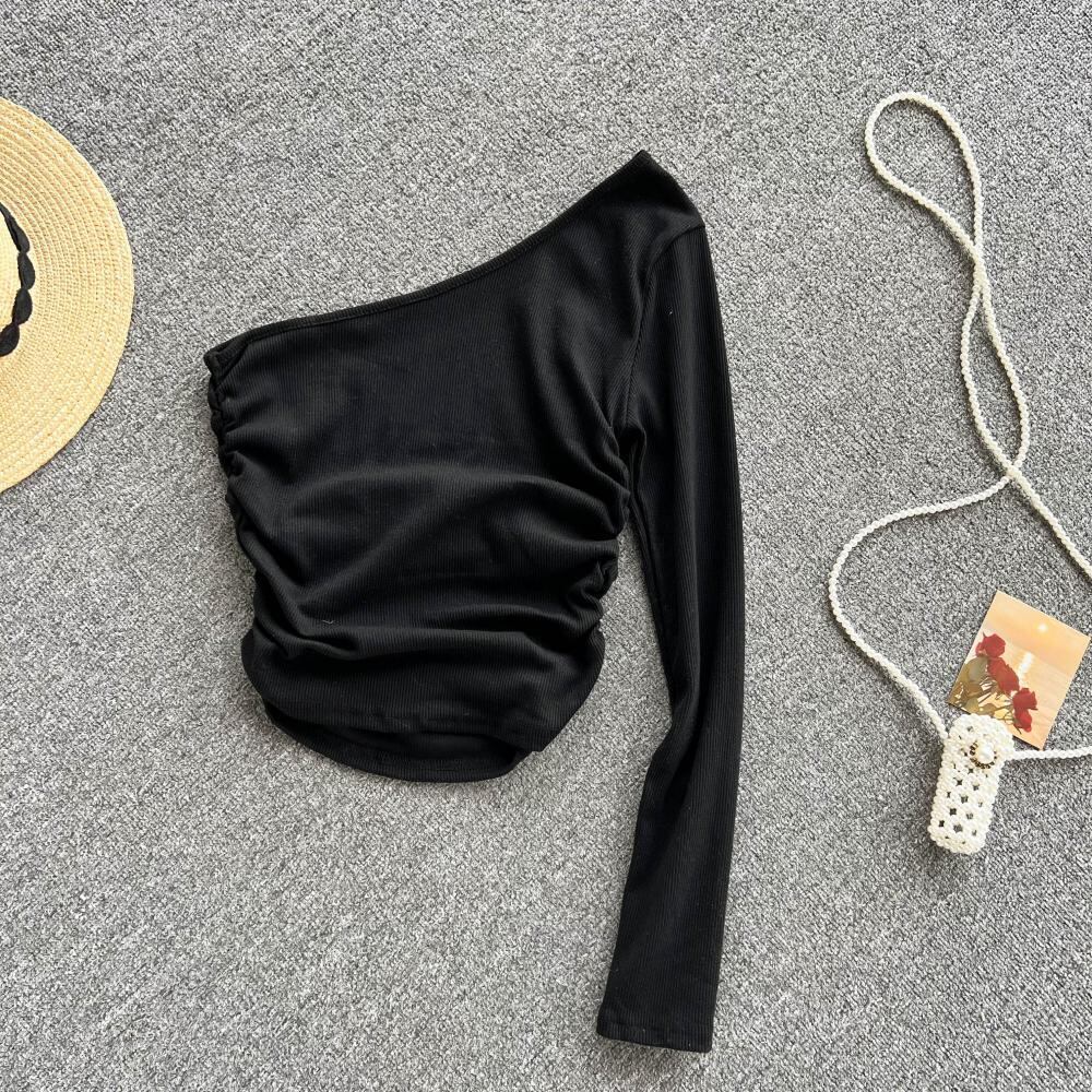 センス パーソナライズ ワンショルダー 長袖 Tシャツ レディース 秋のニッチ プリーツ 自己修養 ショート 斜め肩 ニットトップ ロング オータム 秋物 lyxaj86337132857