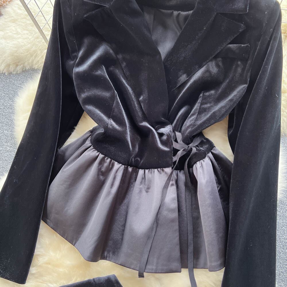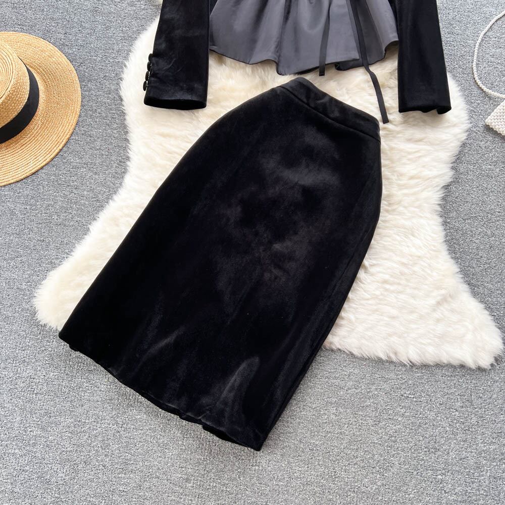 秋と冬の小さな香りのする風のベルベットのスーツの女性のスーツの襟フリル付きのスプライシングトップ+ヒップスカートのツーピースセット オータム 秋物 ウィンター 冬物 lyxaj62068973597