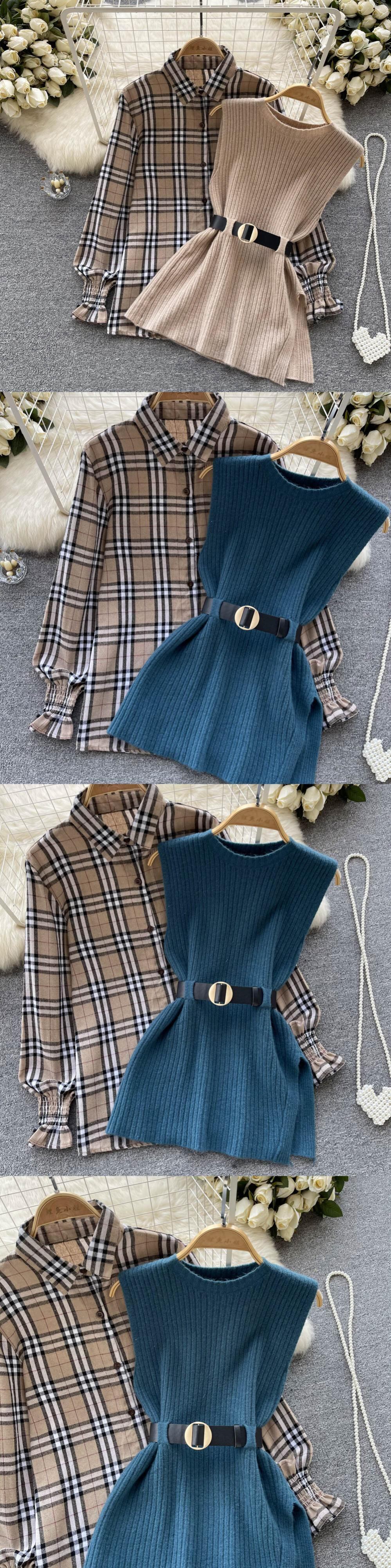 秋と冬の新しい ese スーツ女性のトランペット スリーブ ラペル シャツ + ノースリーブ スリット ウール セーター ベスト 2 点セット オータム 秋物 ウィンター 冬物 lyxaj56556484510