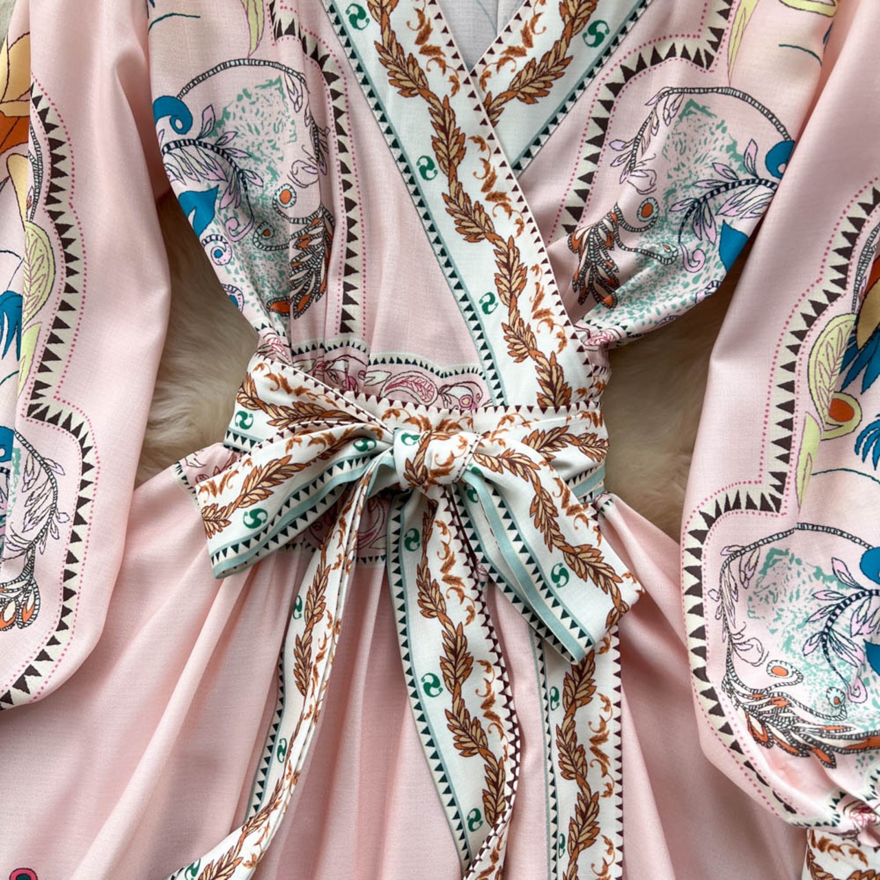 春の新作 V ネック エスニック スタイル長袖プリント ドレス女性のウエスト ストラップ ミドル丈大スイング A ライン フェアリー スカート ロング スプリング 春物 Vネック Aライン lyxaj70509364487