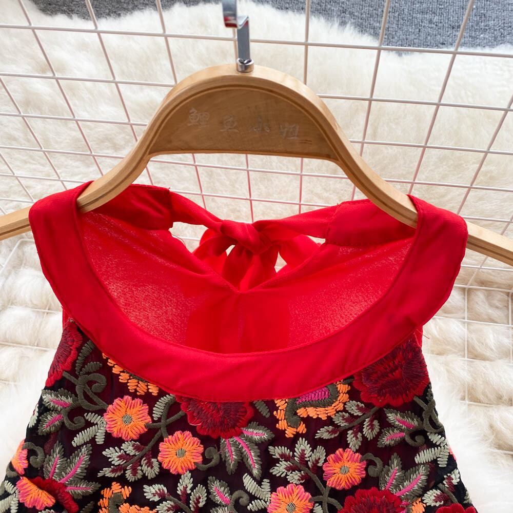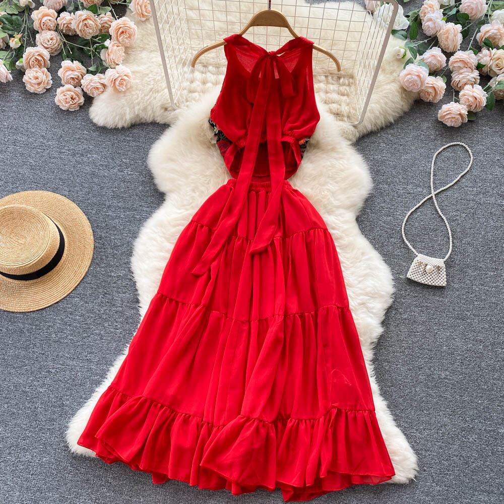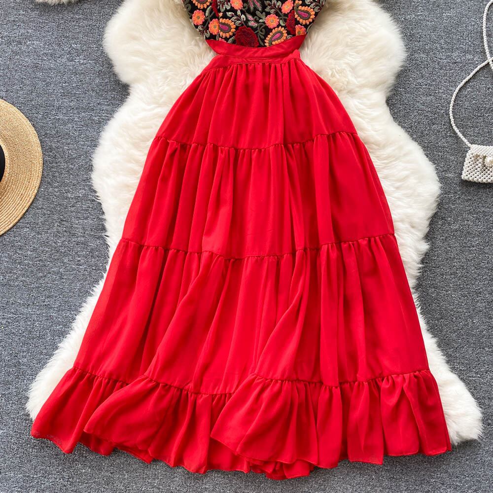 レッドノースリーブレトロ刺繍エスニックシフォンドレスウエスト痩身スーパーフェアリービッグスイングビーチロングドレス lyxaj99343553824