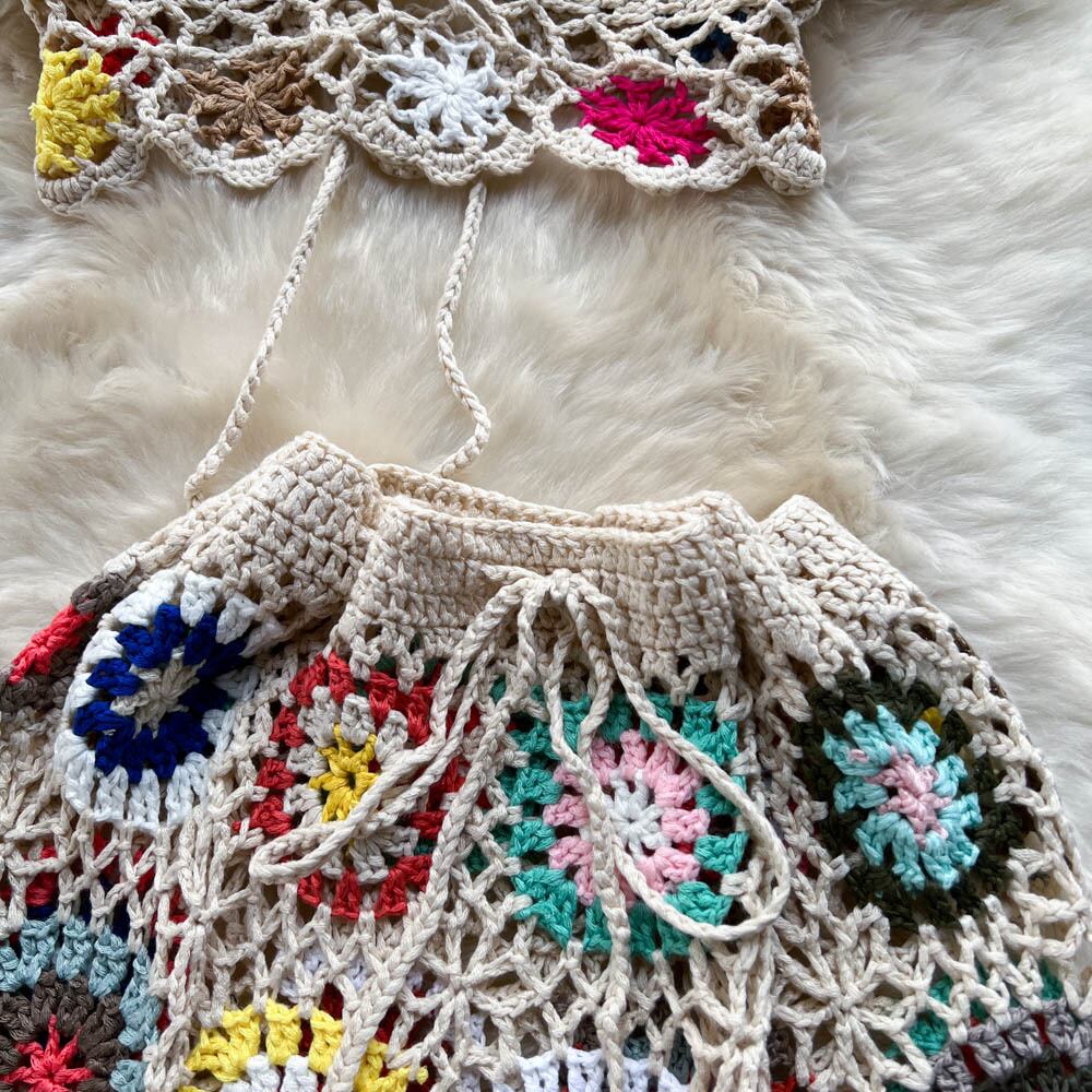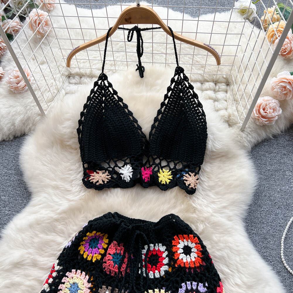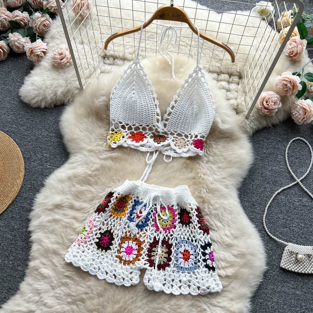 2023 夏ボヘミア手かぎ針編み中空衣装女性の V ネックチューブトップ + ワイドレッグショーツ 2 点セット サマー 夏物 ブルマー Vネック lyxaj28316489872