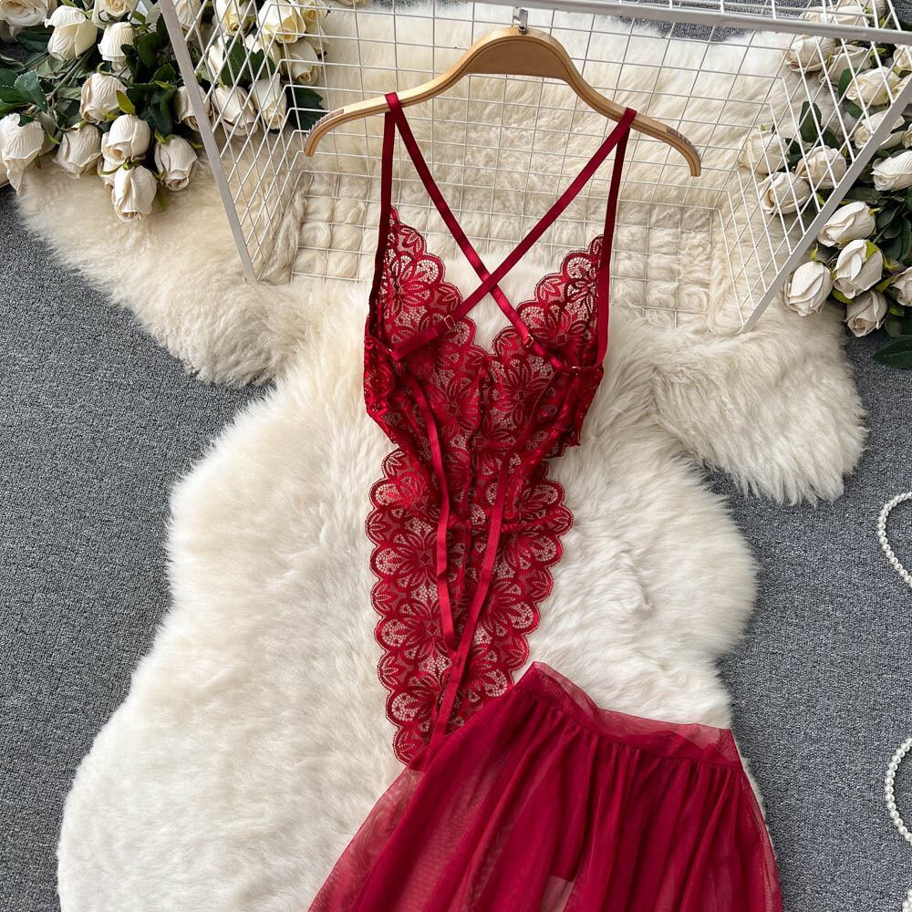 サマーレースセクシークロススリングイレギュラートップ+ミッドレングスメッシュシフォンスカートツーピーススーツ 夏物 lyxaj17420047924