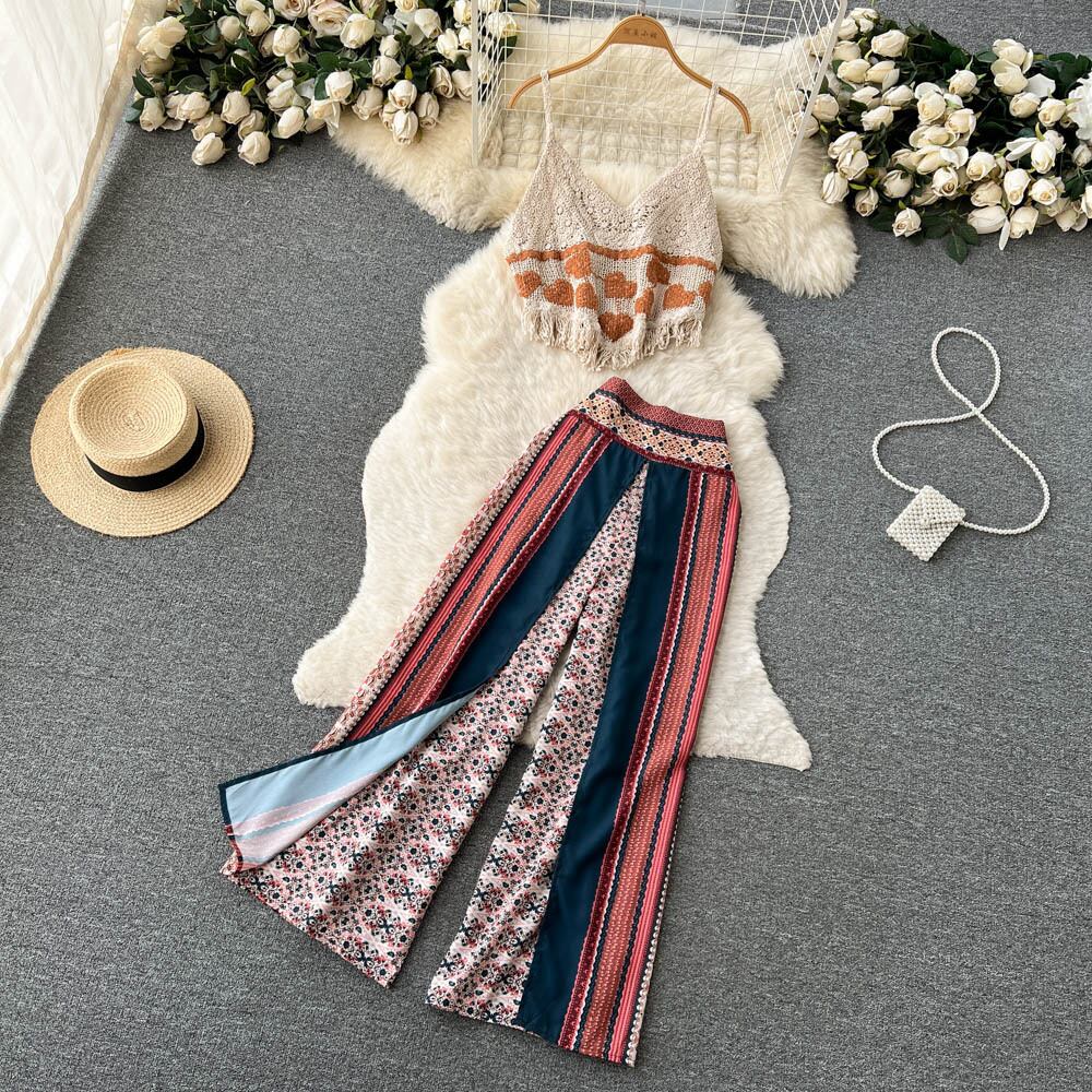 ボヘミアンエスニックスタイルスーツレディースフリンジチューブトップサスペンダー+プリントワイドパンツシフォンビーチパンツ2点セット lyxaj79587680285