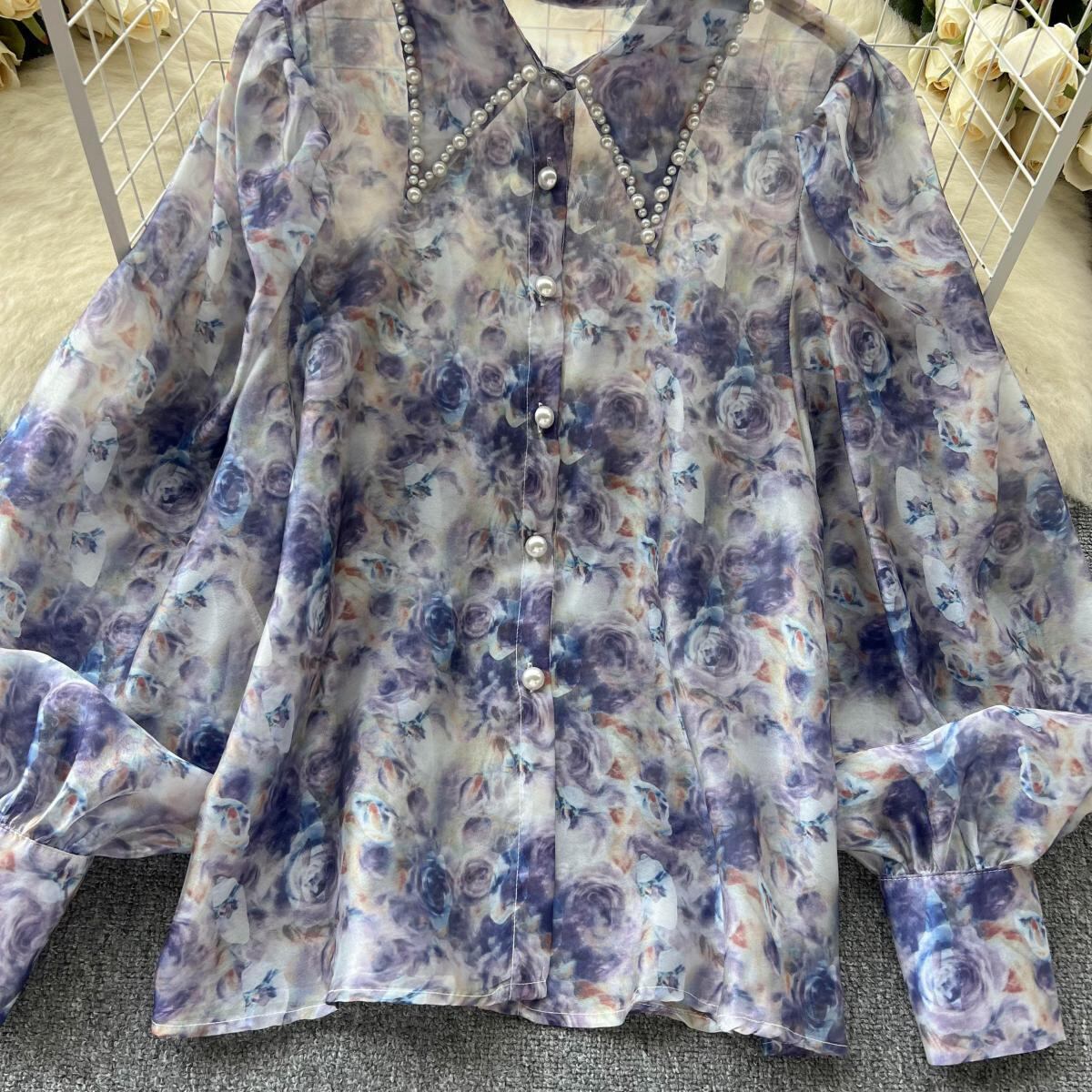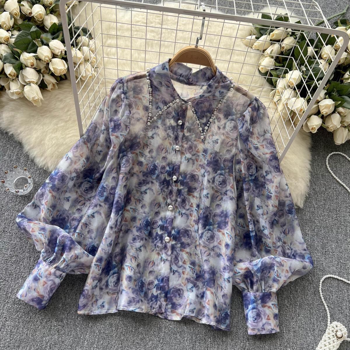 春デザインセンスニッチパフスリーブ花柄シャツ女性レトロルーズ薄手ラペル甘いシフォンシャツ潮 大人ガーリー スウィート キュート カジュアル スプリング 春物 lyxaj55994686045