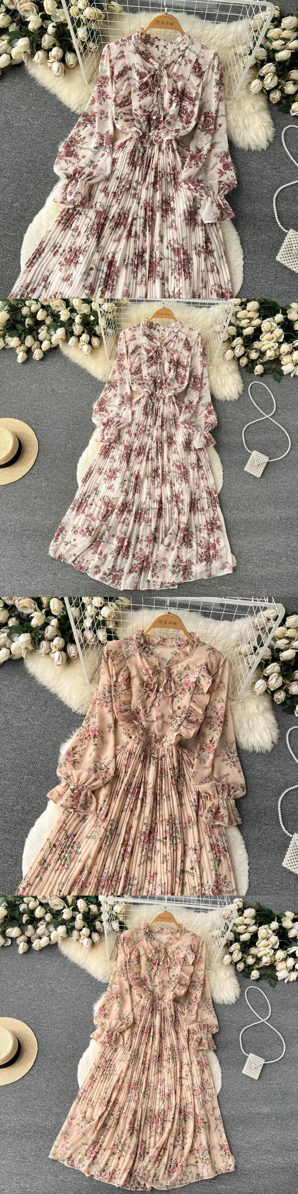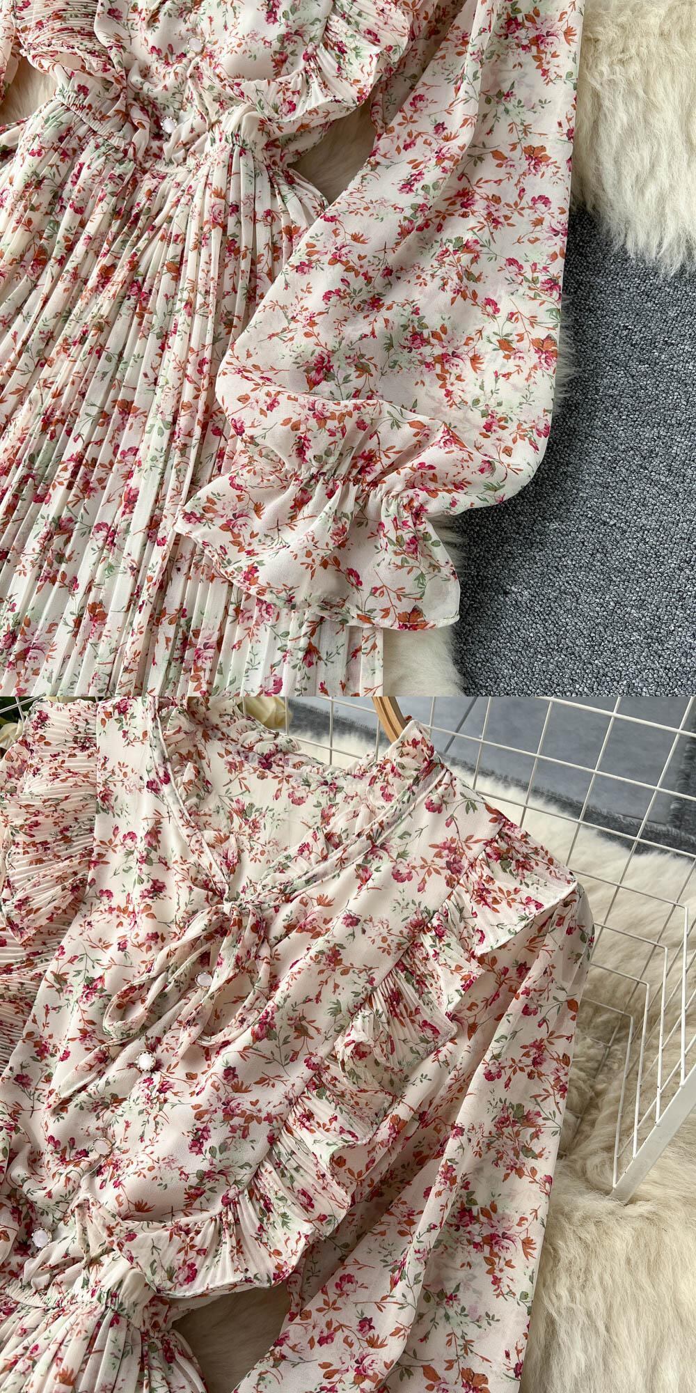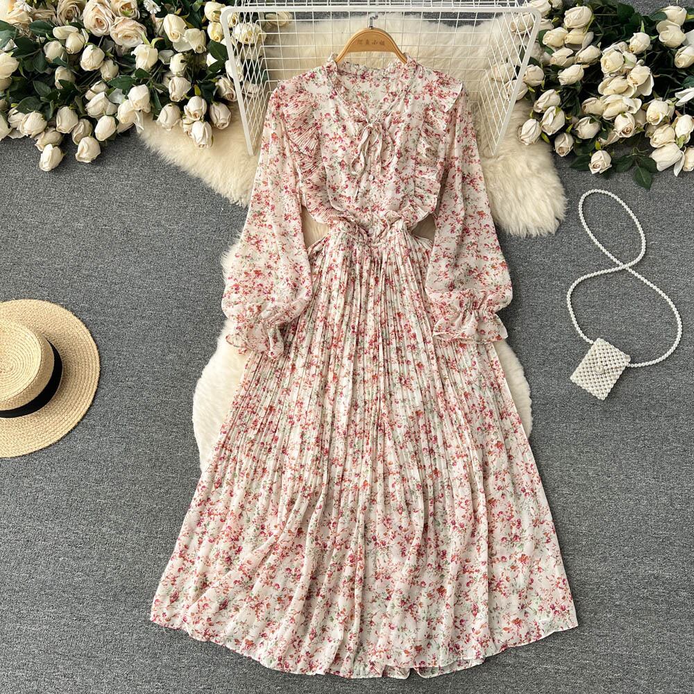 2023 春の新フレンチ V ネック長袖ウエスト気質小さな新鮮な花柄ドレス女性プリーツロングスカート スプリング 春物 Vネック lyxaj33110700837