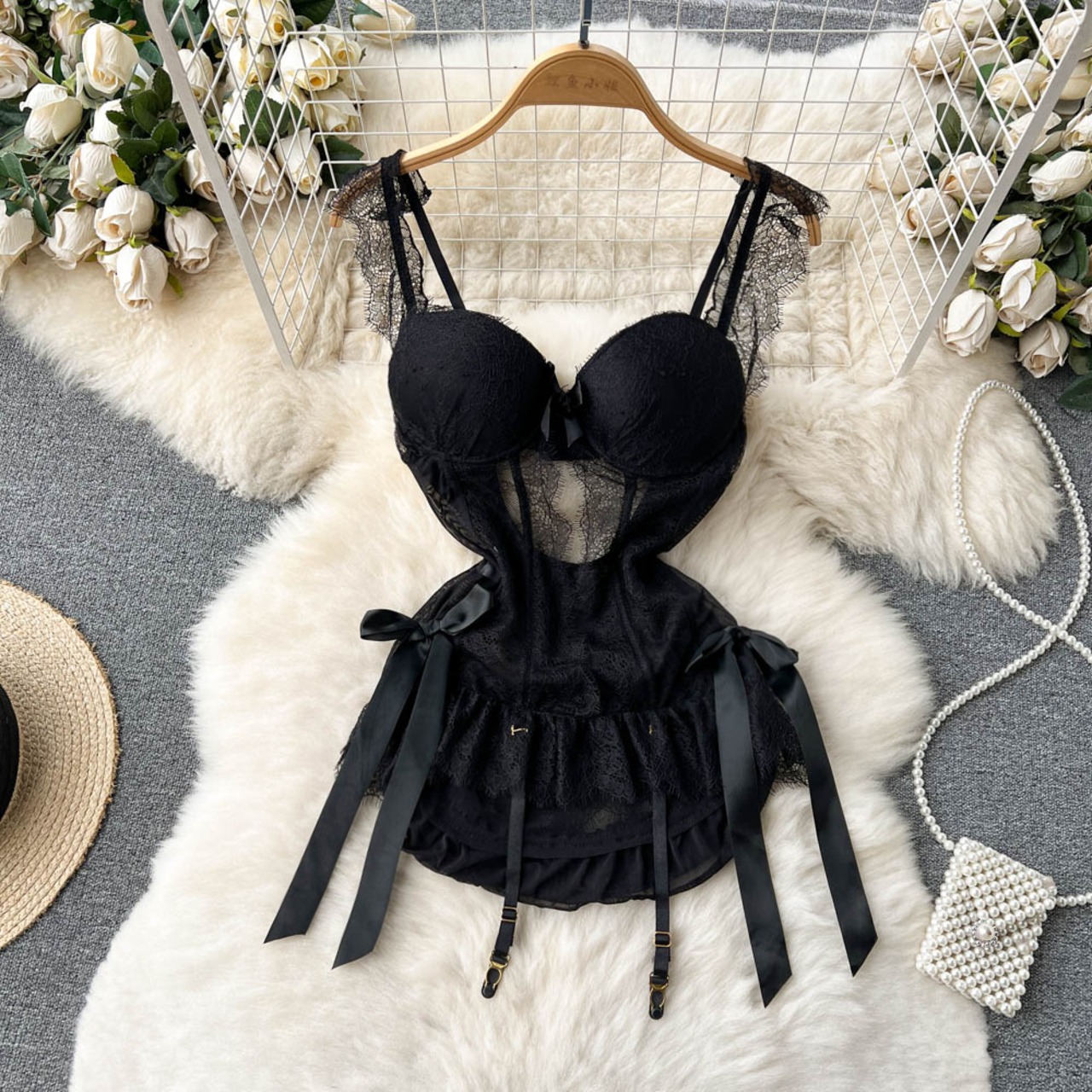 夏新ダークブラックタイラップ胸サスペンダー寝間着フェミニンな背中の開いたちょう結び中空レースメッシュドレス リボン サマー 夏物 lyxaj88508563016
