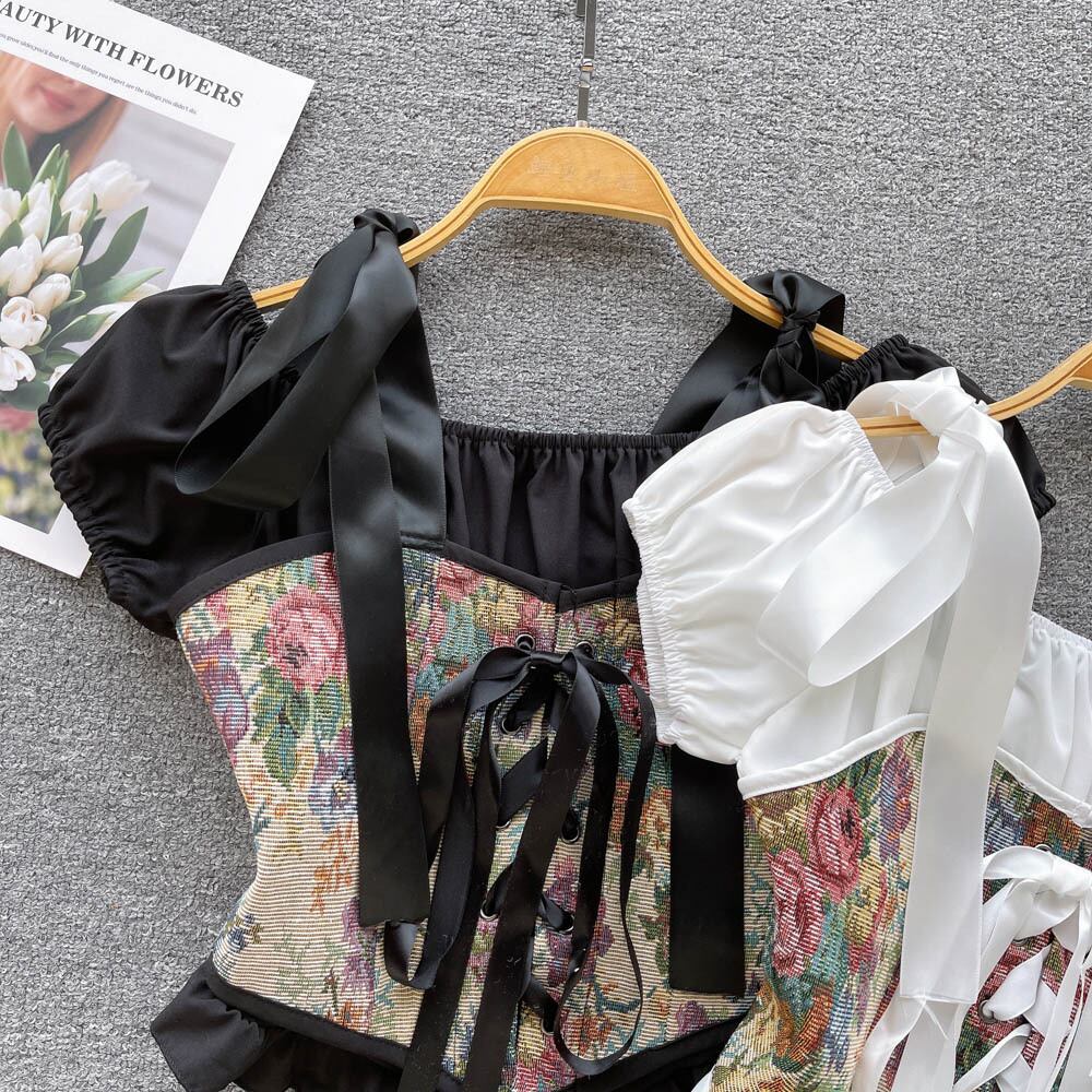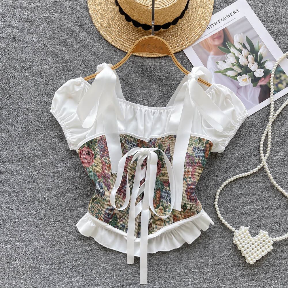 フレンチスクエアカラーフリル半袖トップレディースサマーウェアレトロニッチスプライシングフローラルショートシャツ 夏物 花柄 スクウェア lyxaj33168016770