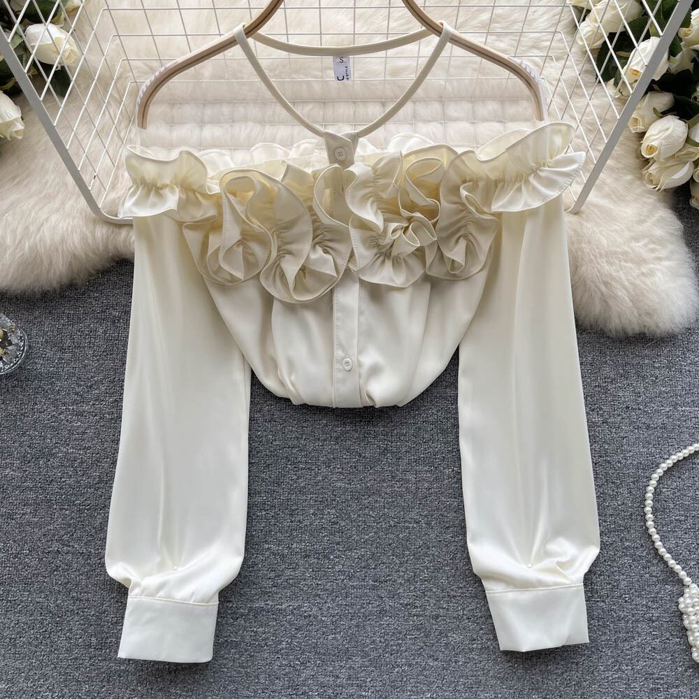 フランスの気質の花のスプライシングメッシュシャツの女性の春と秋の新しい純粋な欲望ワンショルダーのシックな長袖の妖精のトップ ロング スプリング 春物 オータム 秋物 ピュア フラワーデザイン lyxaj72557994450
