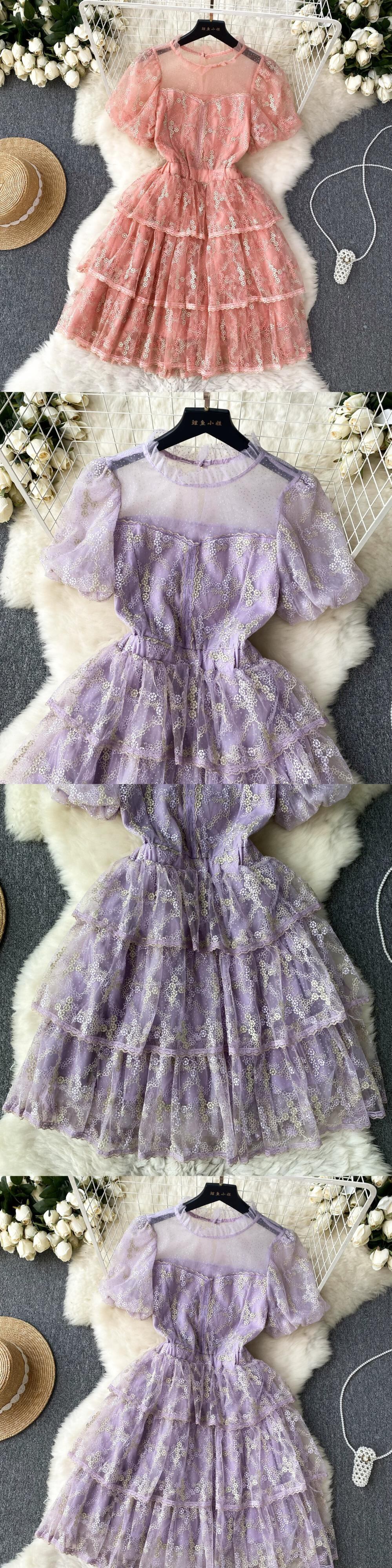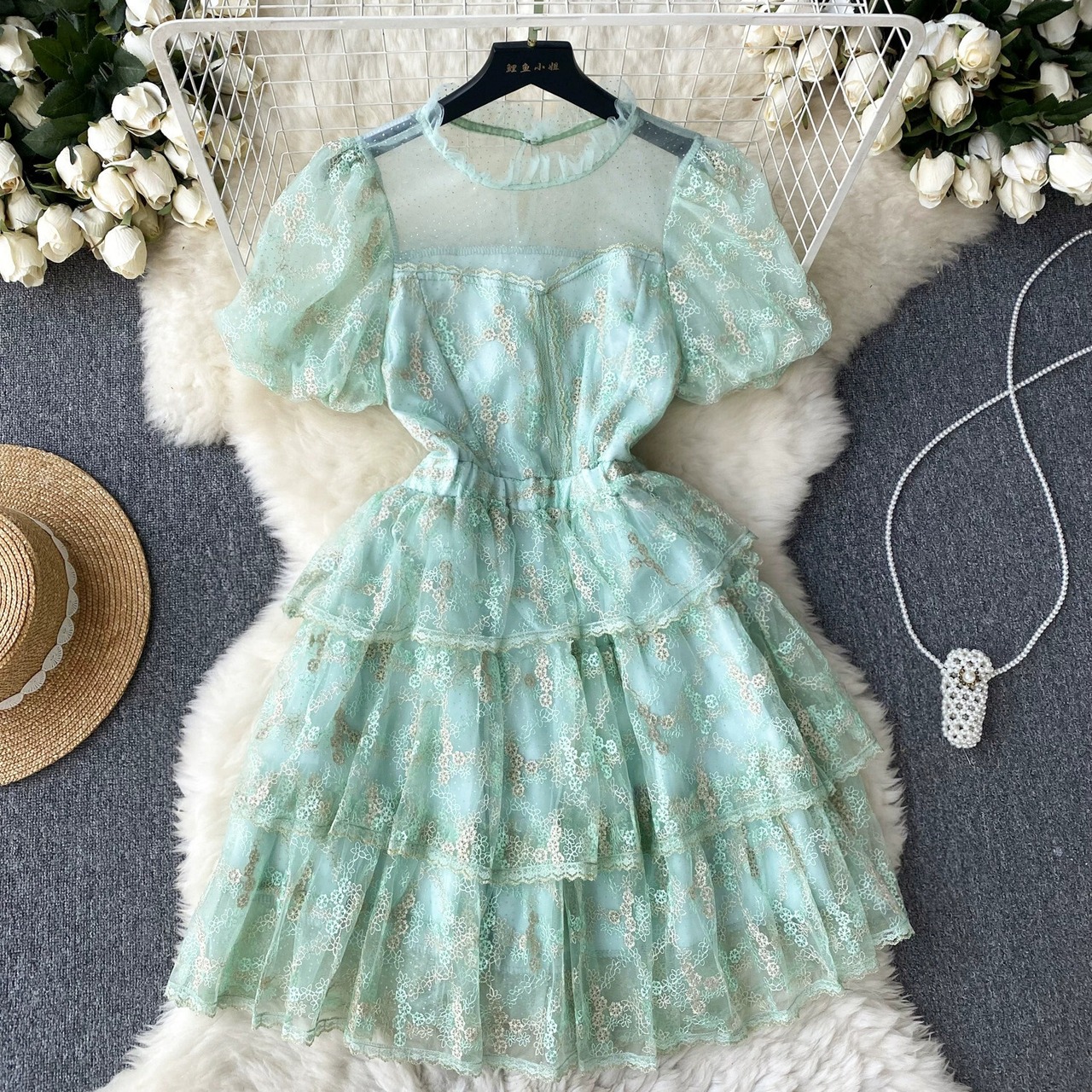 フレンチスタイルの優しいスタイルのレースフックフラワー刺繍パフスリーブドレス女性のウエスト痩身気質aラインケーキスカート フラワーデザイン lyxaj83646725573
