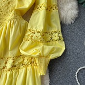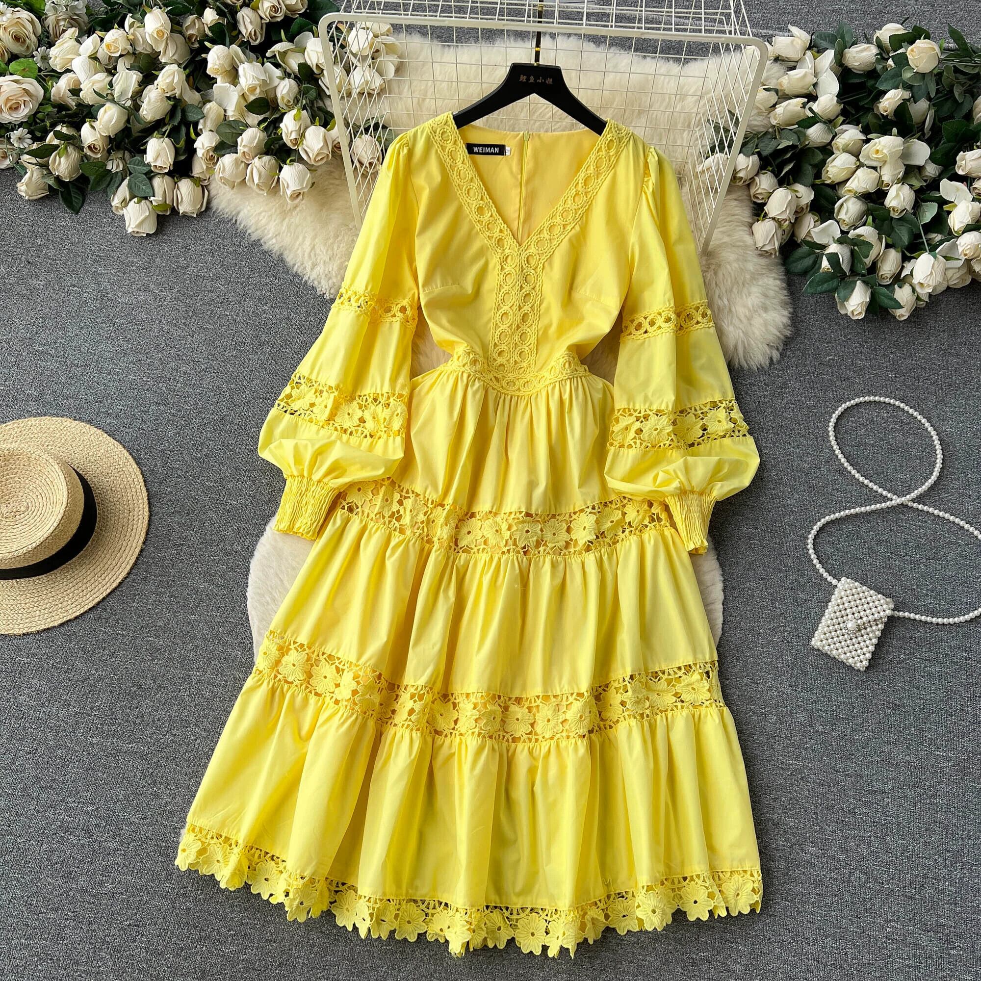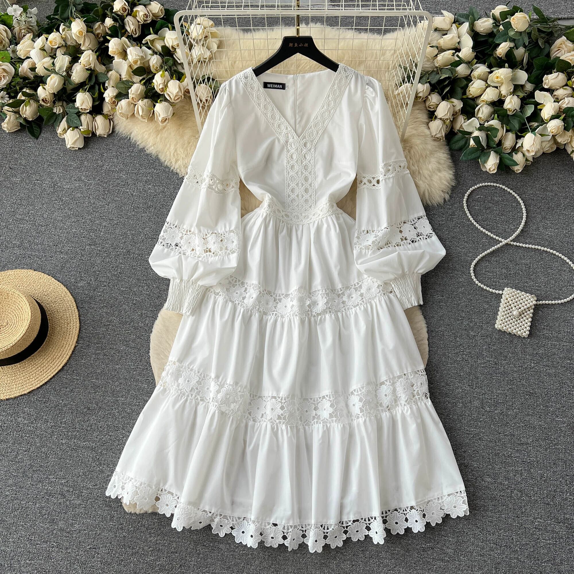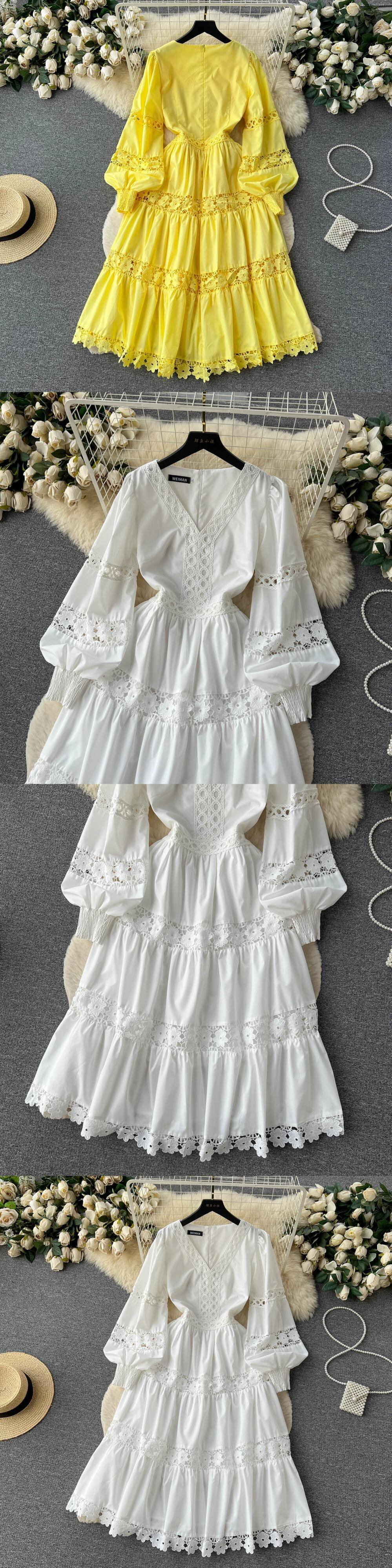 ニッチデザインセンスロイヤルシスタースタイルVネックランタンスリーブ小さな香りの風水溶性レースステッチスリムハイエンドドレス lyxaj44369252796