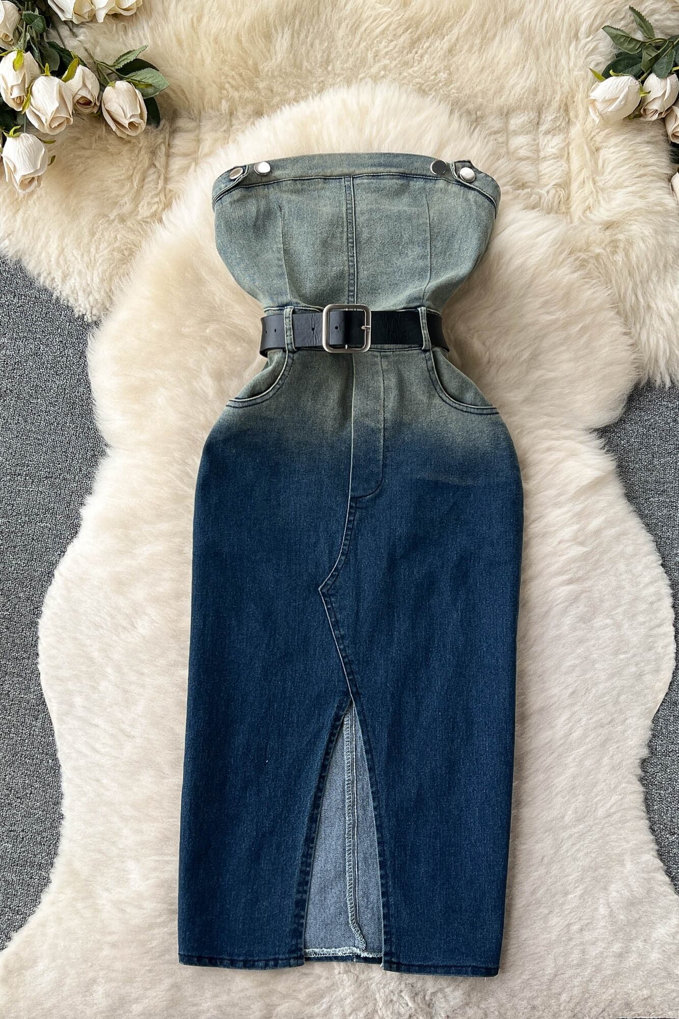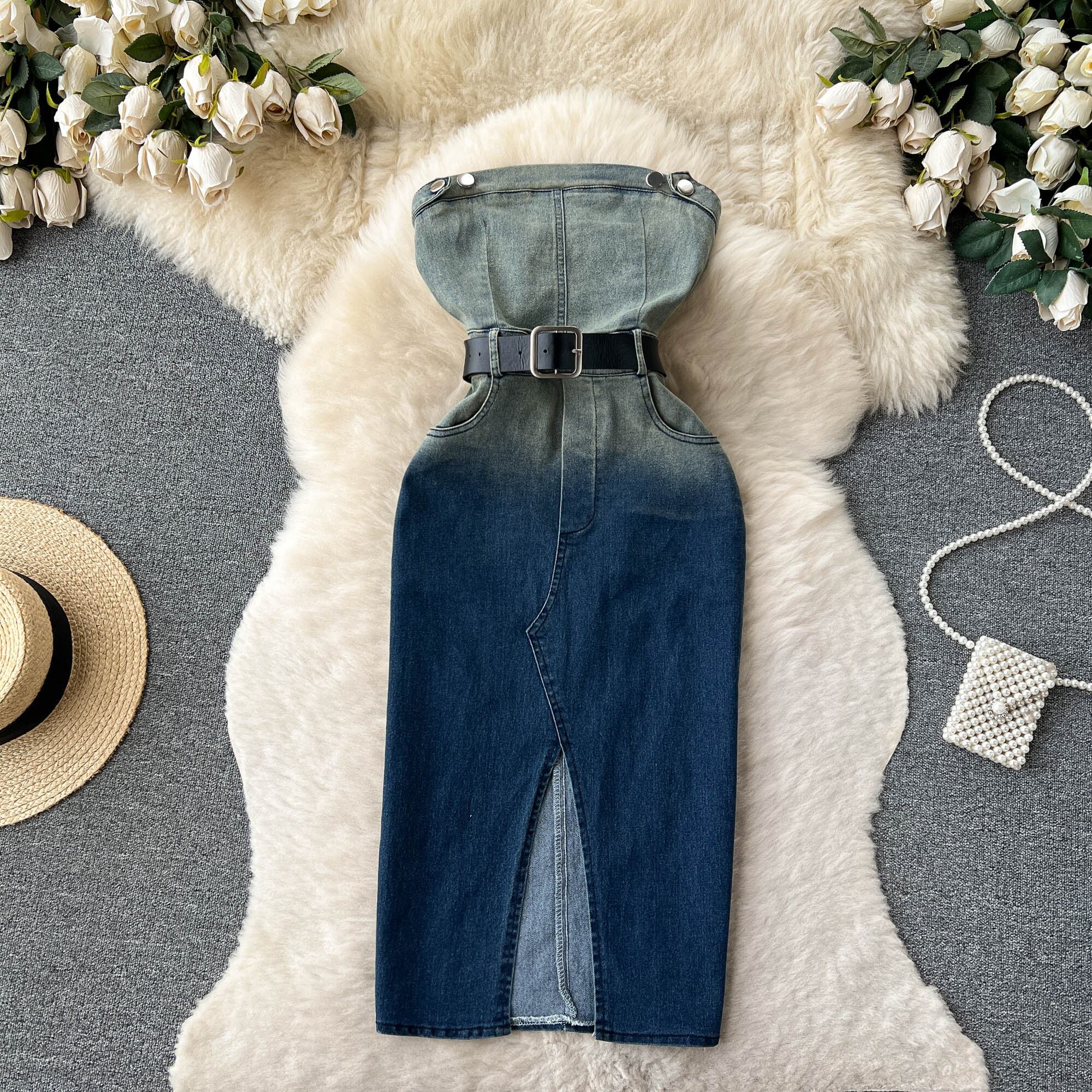 純粋な欲望のセクシーなワンショルダーチューブトップデニムスリットスカート夏の新しいハイエンド気質ドレス潮 サマー 夏物 lyxaj48579871971