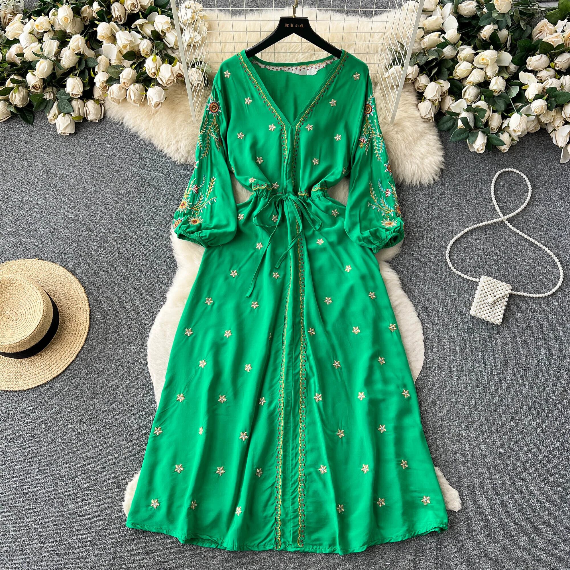 ボヘミアンエスニックスタイルのレトロな重工業刺繍長袖ネクタイウエスト痩身旅行ホリデードレス ロング lyxaj34130506517