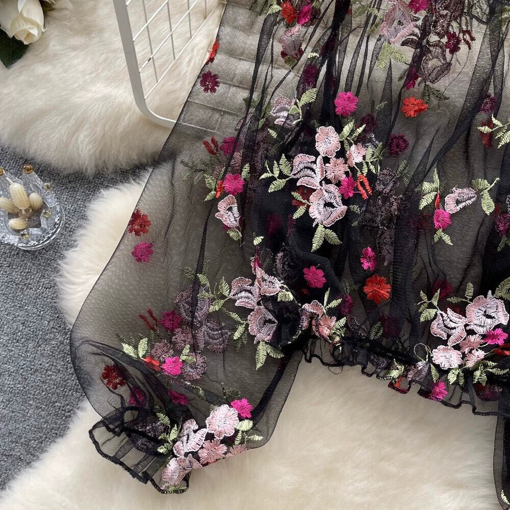 ワンショルダーネット糸刺繍シースルーシャツレディース夏ゆったりアウターパフスリーブショートブラウス長袖レースシャツ ロング サマー 夏物 lyxaj78486436298