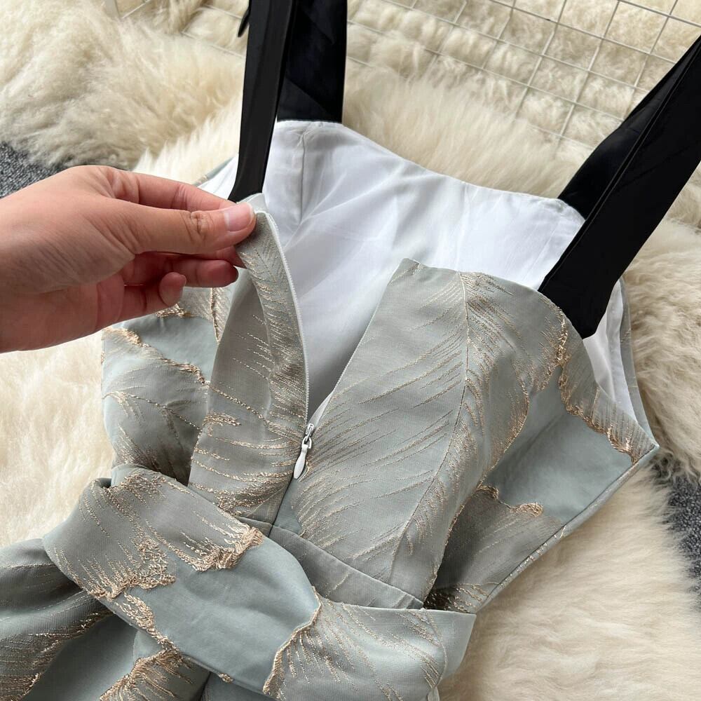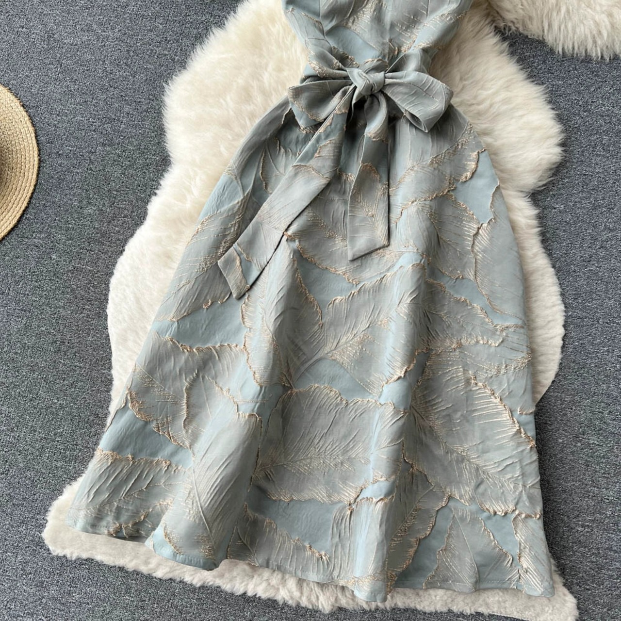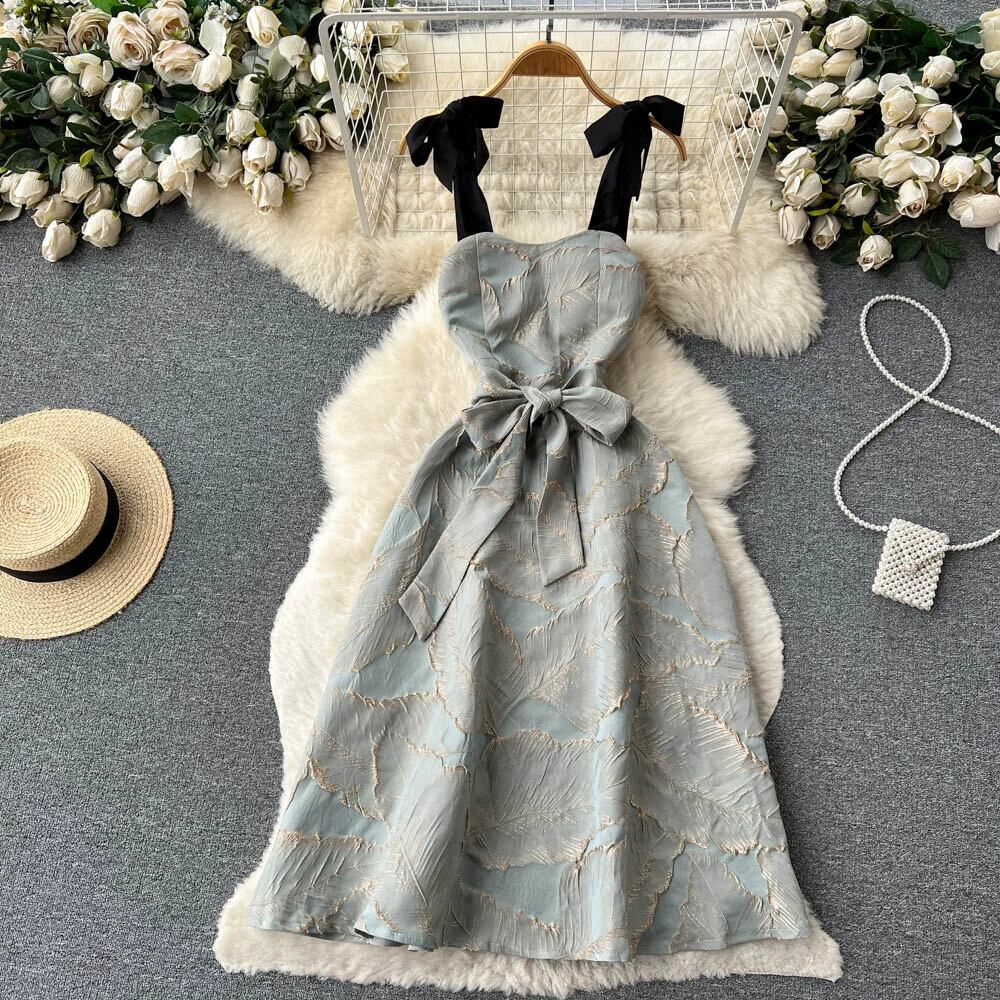 気質パーティー パーティードレス スカート レディース ロングスカート ニッチ 蝶ネクタイ ストラップ ジャカード ビッグ スイング ウエスト サスペンダー ドレス リボン lyxaj89909874490